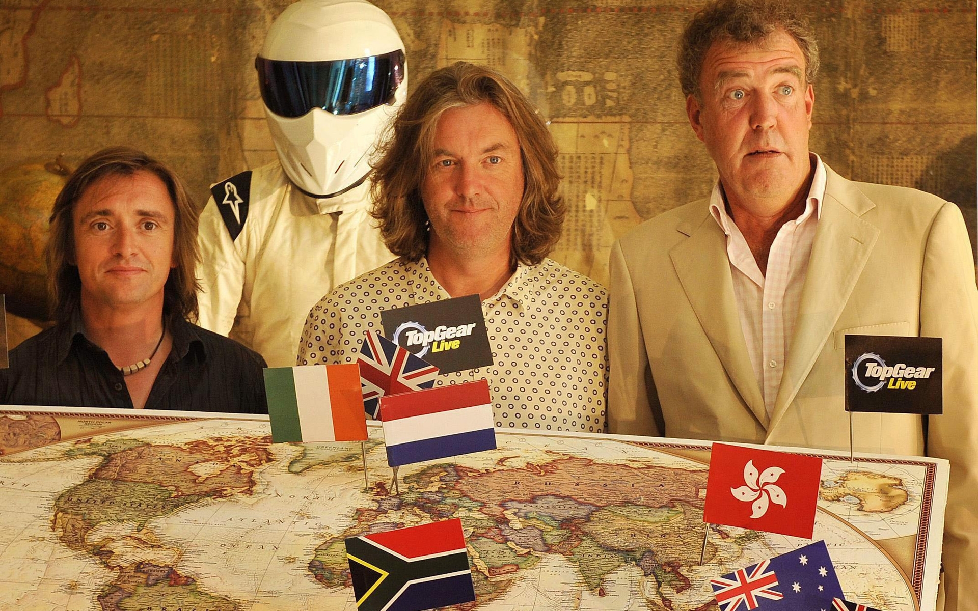 Description: Three men standing around a world map with flags on it and a man in a suit and helmet on the side.