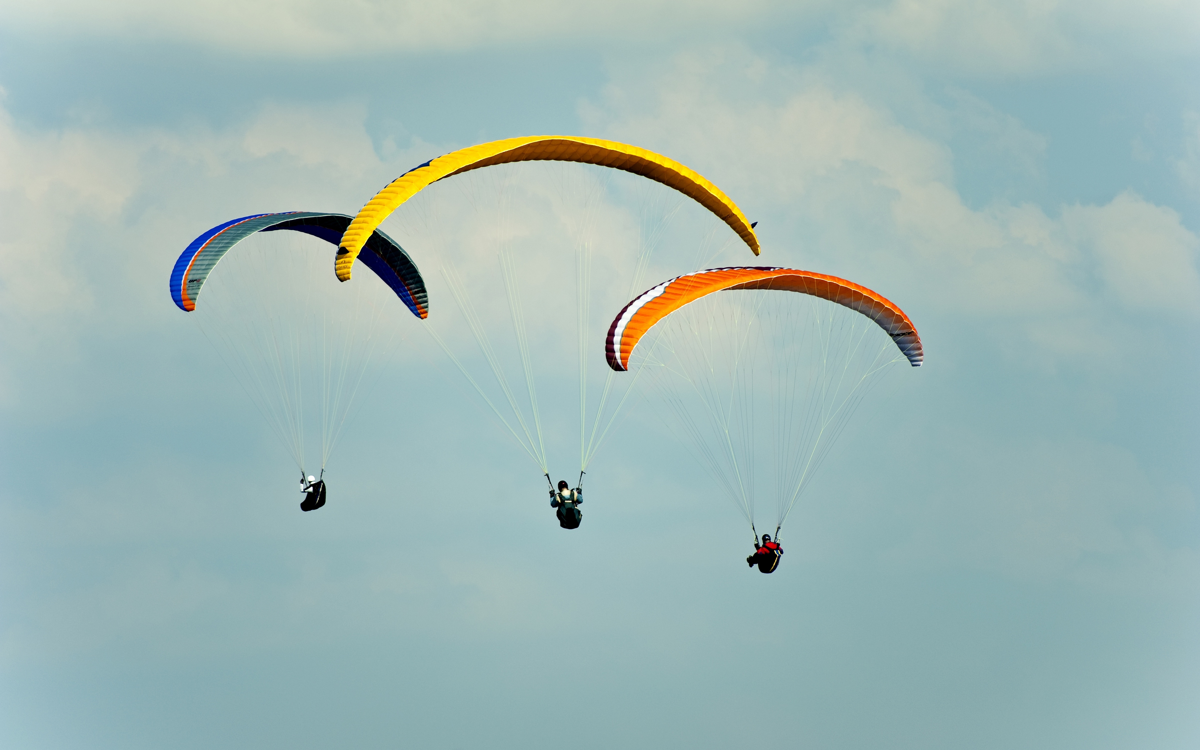 Description: Two people parasailing in the sky with a sky background and clouds in the background.