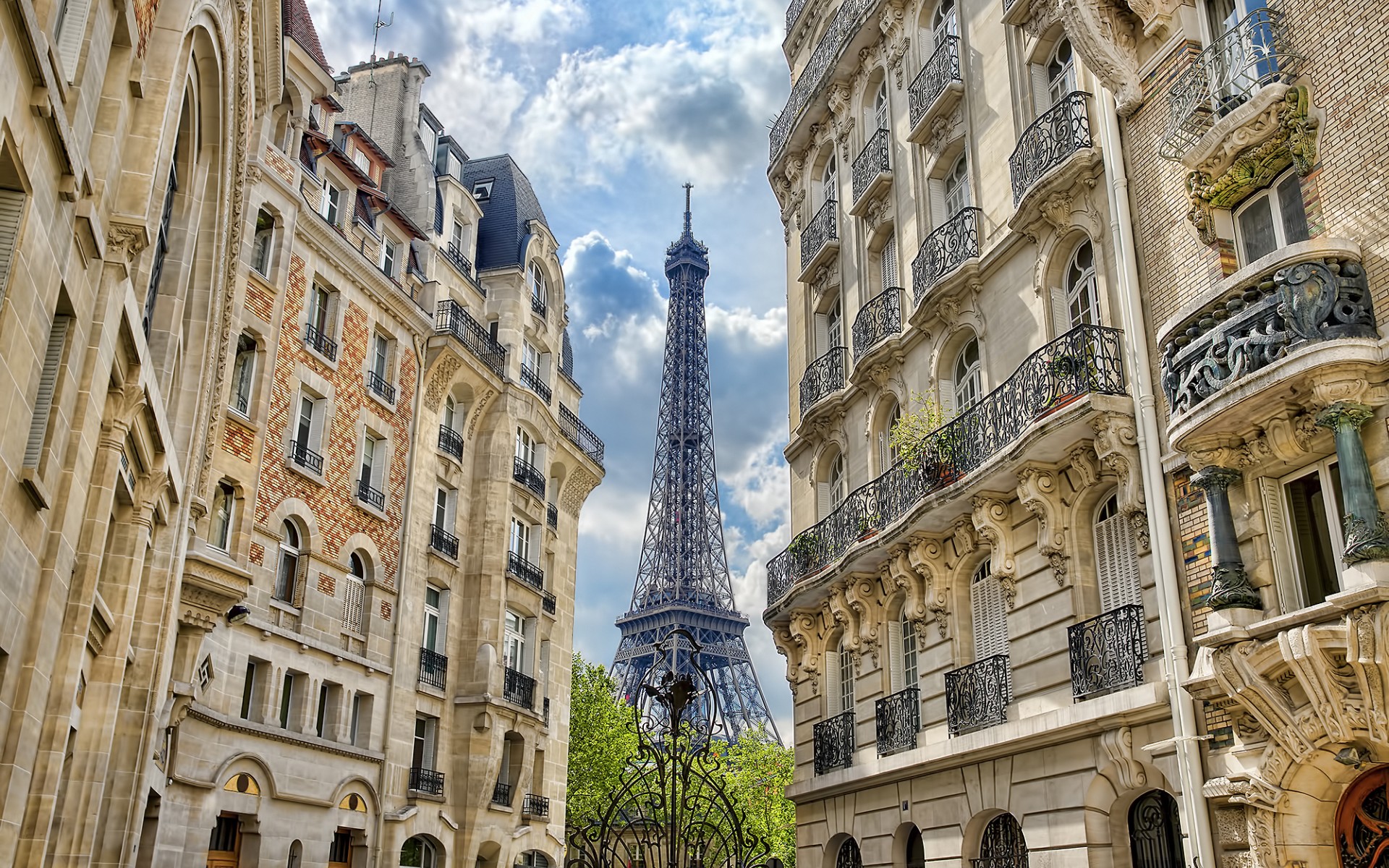 Description: A street with a tower in the background and buildings around it with a cloudy sky in the background.