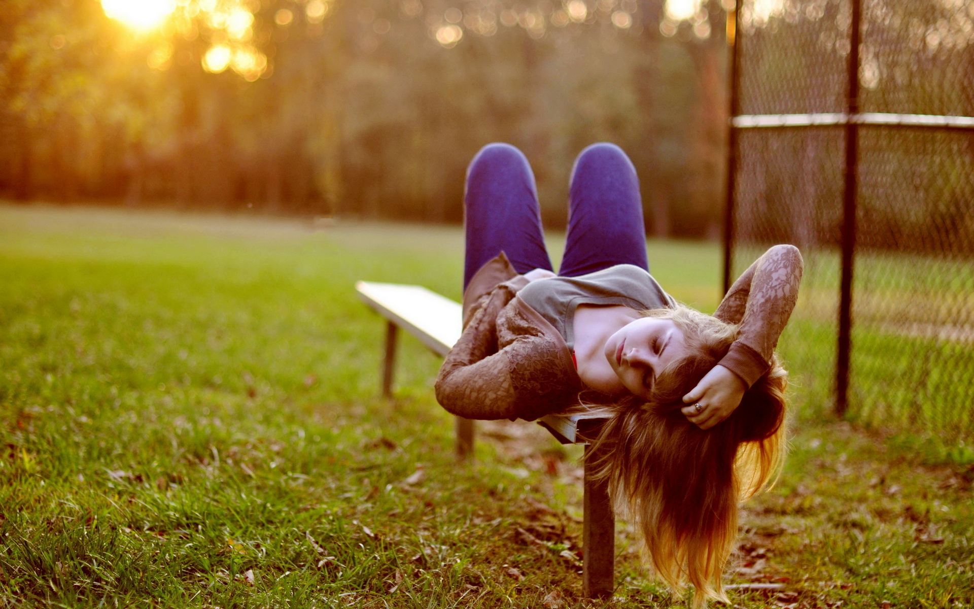 Description: A person laying on a bench in a park with their legs up on the bench and their head in the air.