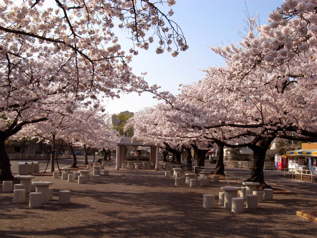 Description: A park with benches and trees with pink flowers on them and a few benches in the middle of the park.