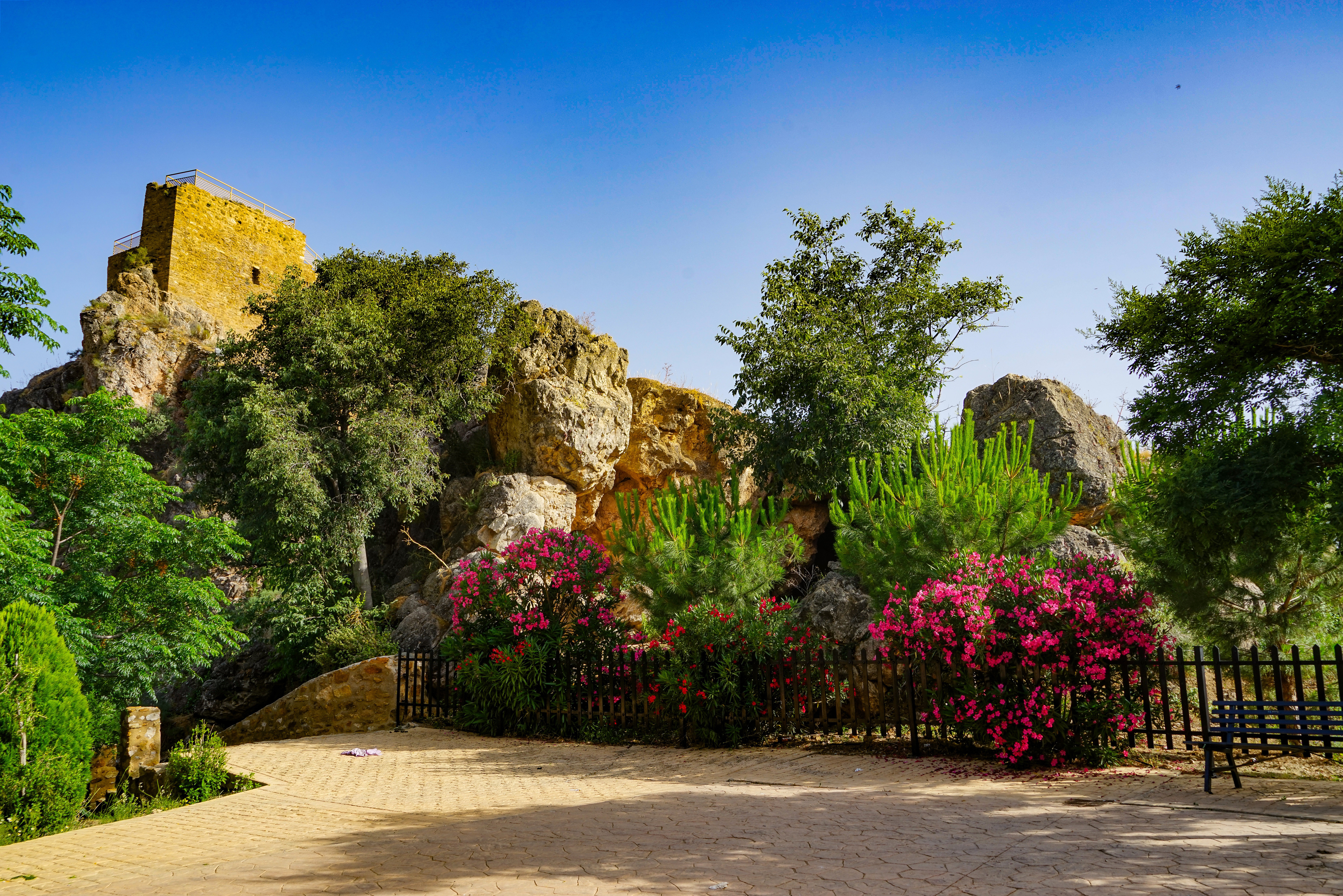 Description: A park with a stone wall and a black fence and flowers on the ground and a rock wall behind it.