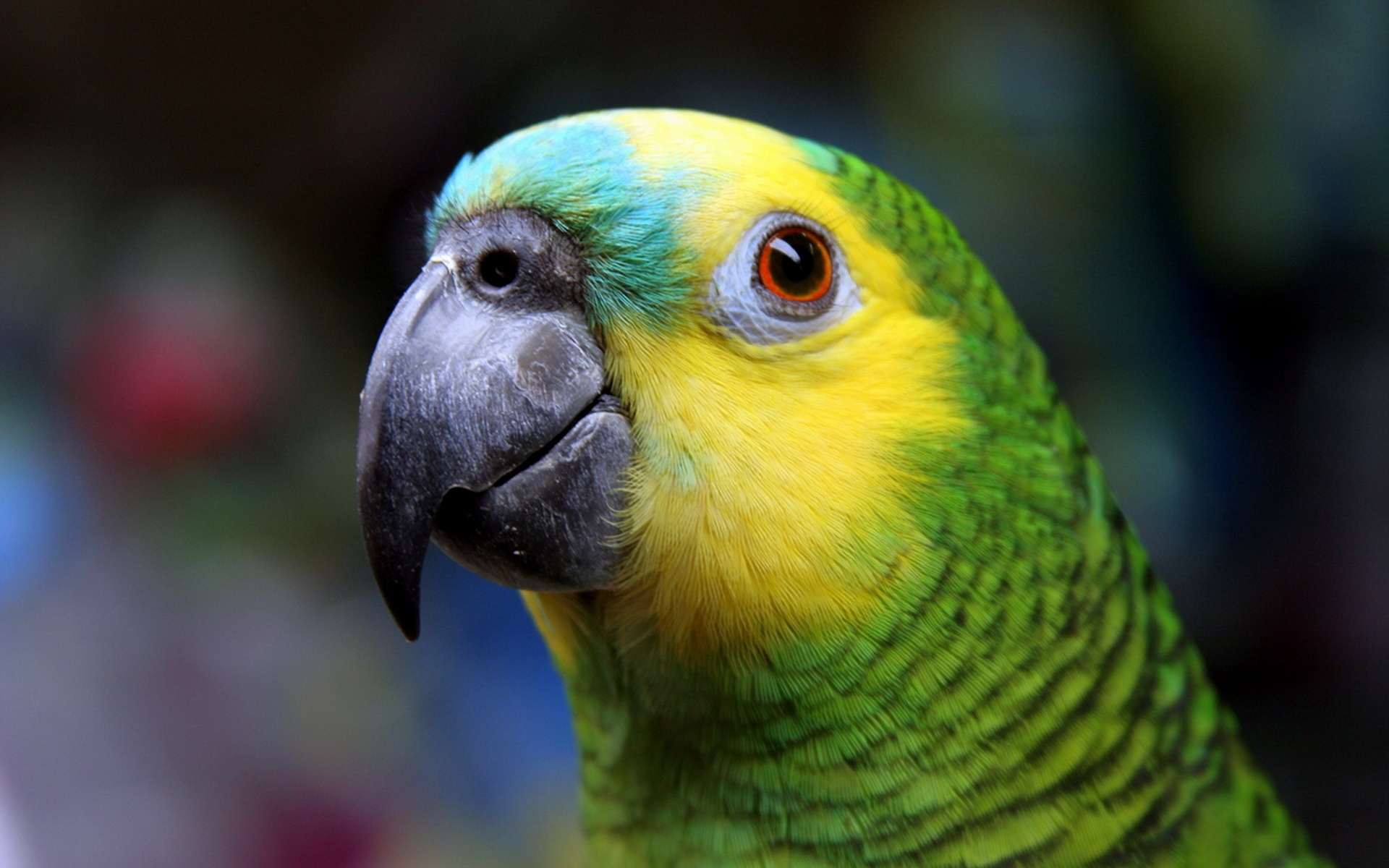 Description: A close up of a parrot with a blurry background of trees and bushes in the background.