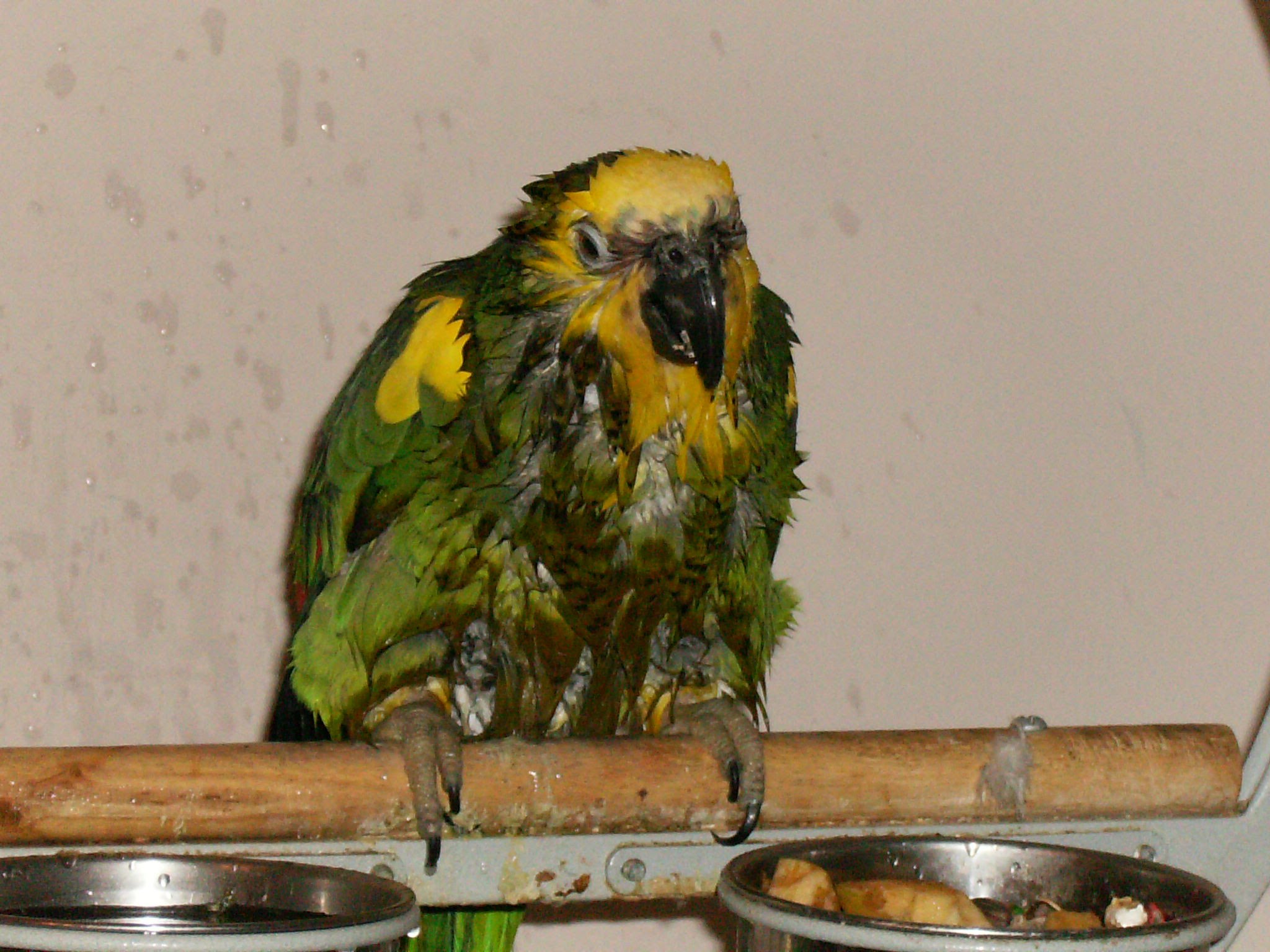 Description: A parrot sitting on a perch with a bowl of food in front of it and a mirror behind it.