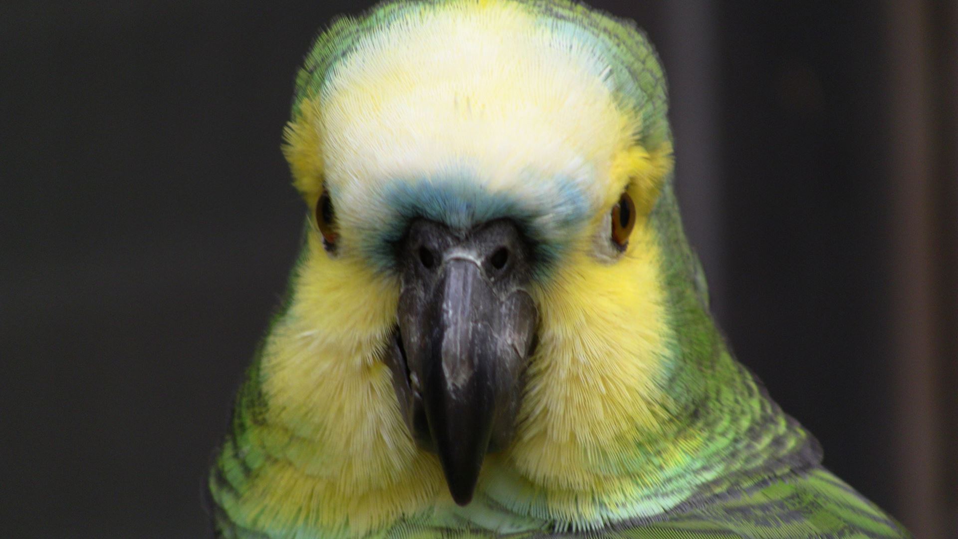 Description: A close up of a parrot with a yellow and green feathers and head and neck feathers and a black background.