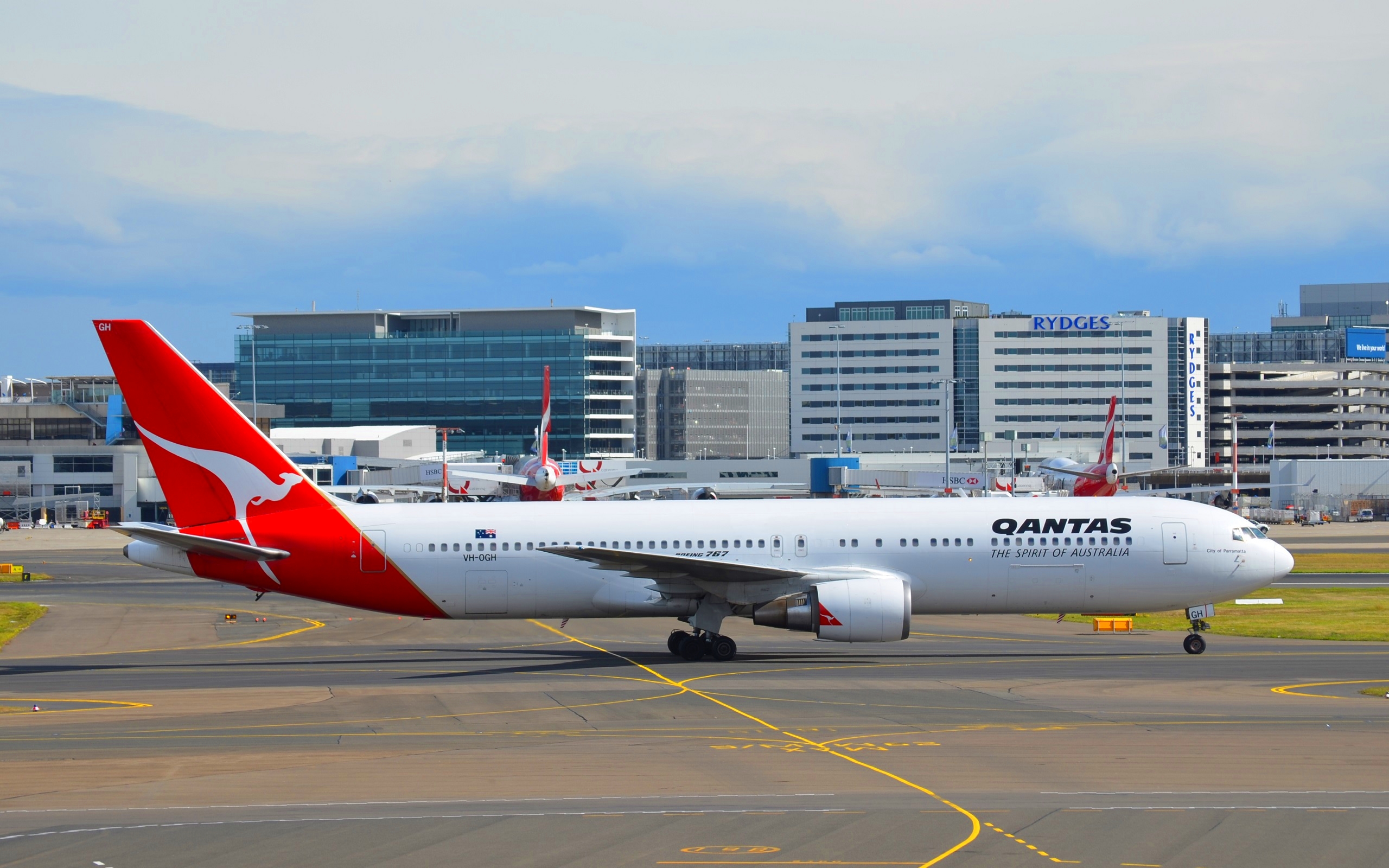 Description: A large passenger jet sitting on top of an airport runway next to a city skyline with tall buildings in the background.
