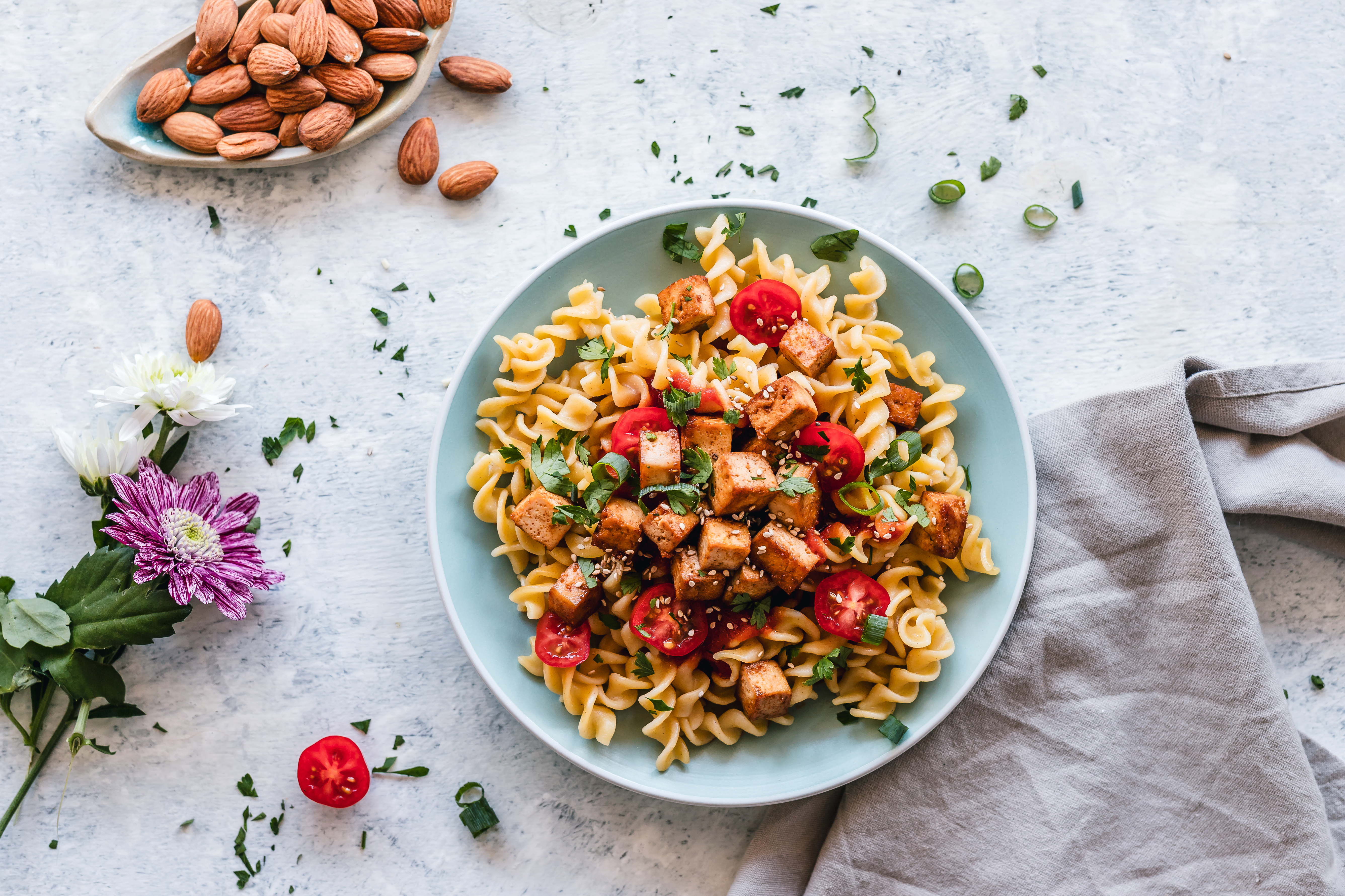 Description: A plate of pasta with nuts and cherry tomatoes on a table with a napkin and a bowl of nuts.