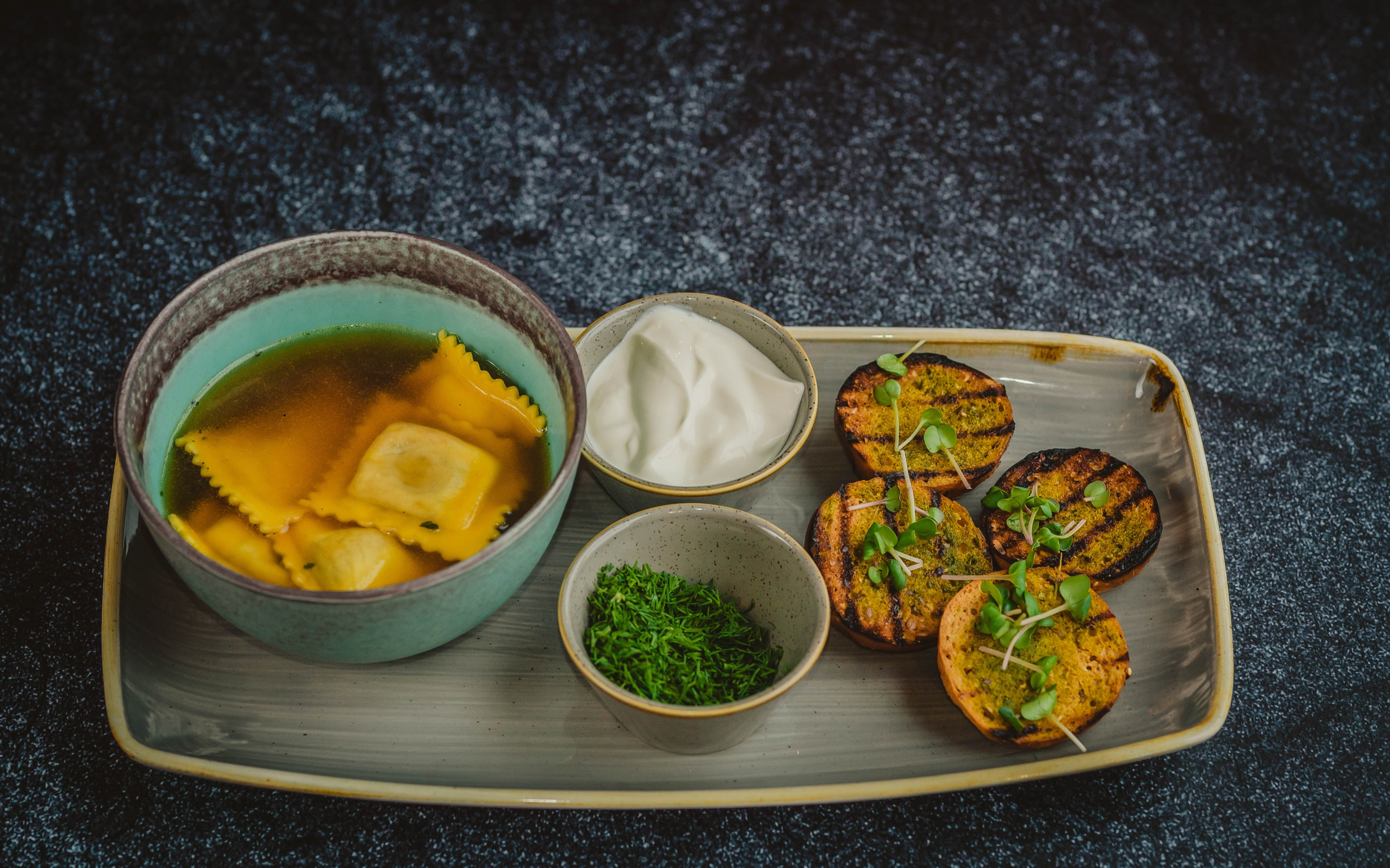 Description: A plate of food with some sort of pasta and sauce on it with a bowl of sour cream and a bowl of sour cream.