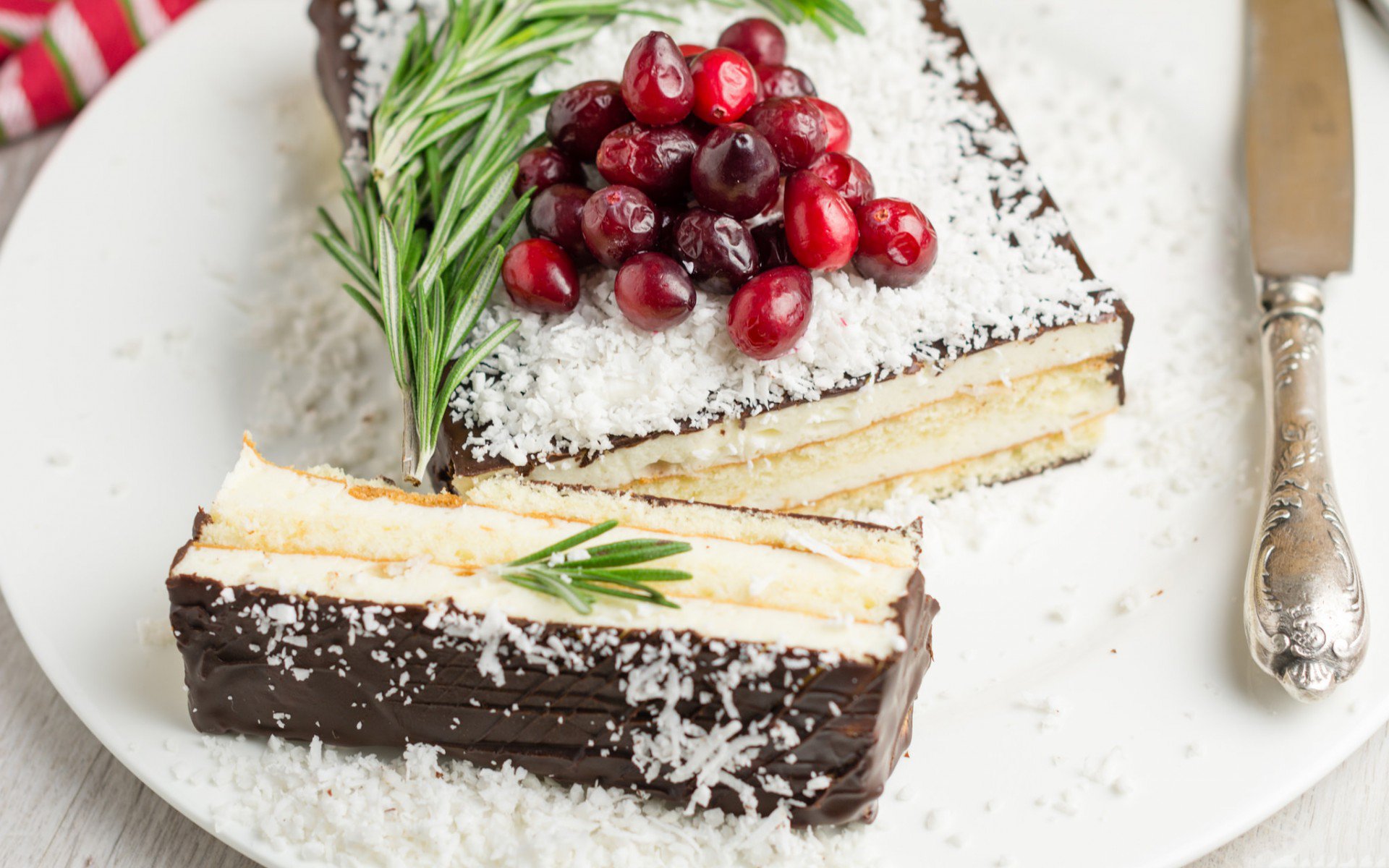 Description: A plate with a cake and some cranberries on it and a knife and fork on the side.