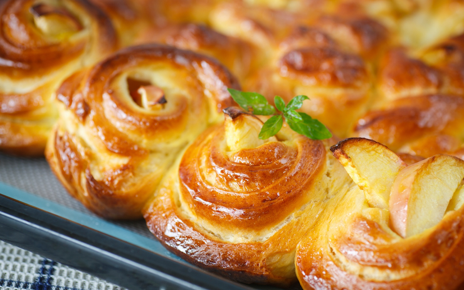 Description: A close up of a pastry with a leaf on top of it and a few other rolls in the background.