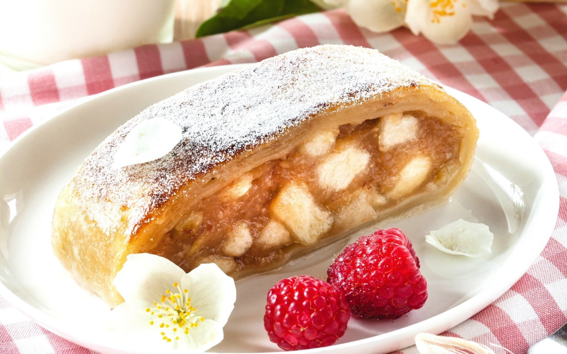 Description: A pastry with powdered sugar and raspberries on a plate with a cup of coffee and flowers.