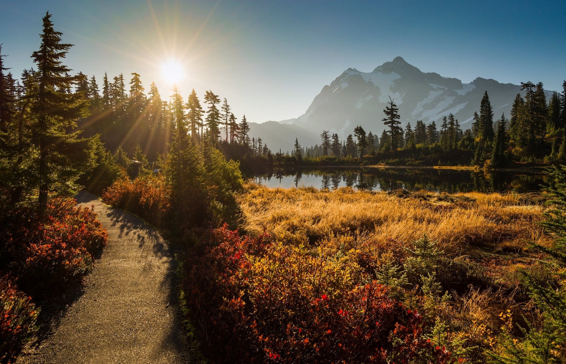 Description: A path leading to a lake surrounded by trees and bushes with the sun shining on the mountain in the background.