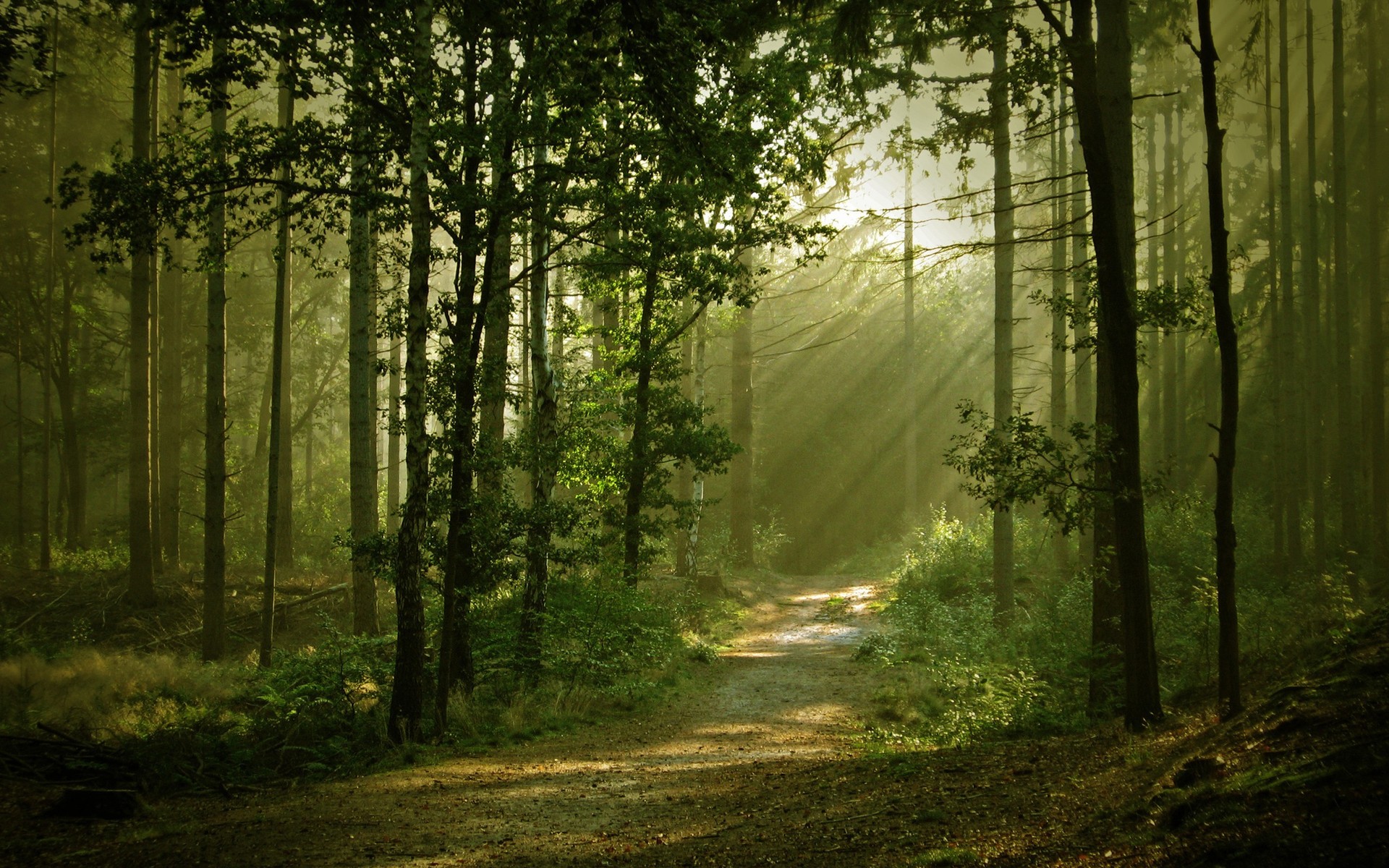 Description: A path in the woods with sun shining through the trees and the sun shining through the trees on the side.