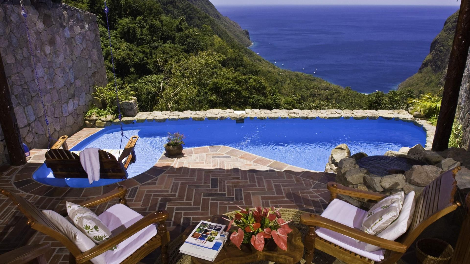 Description: A patio with a pool and chairs and a table with a book on it and a view of the ocean.