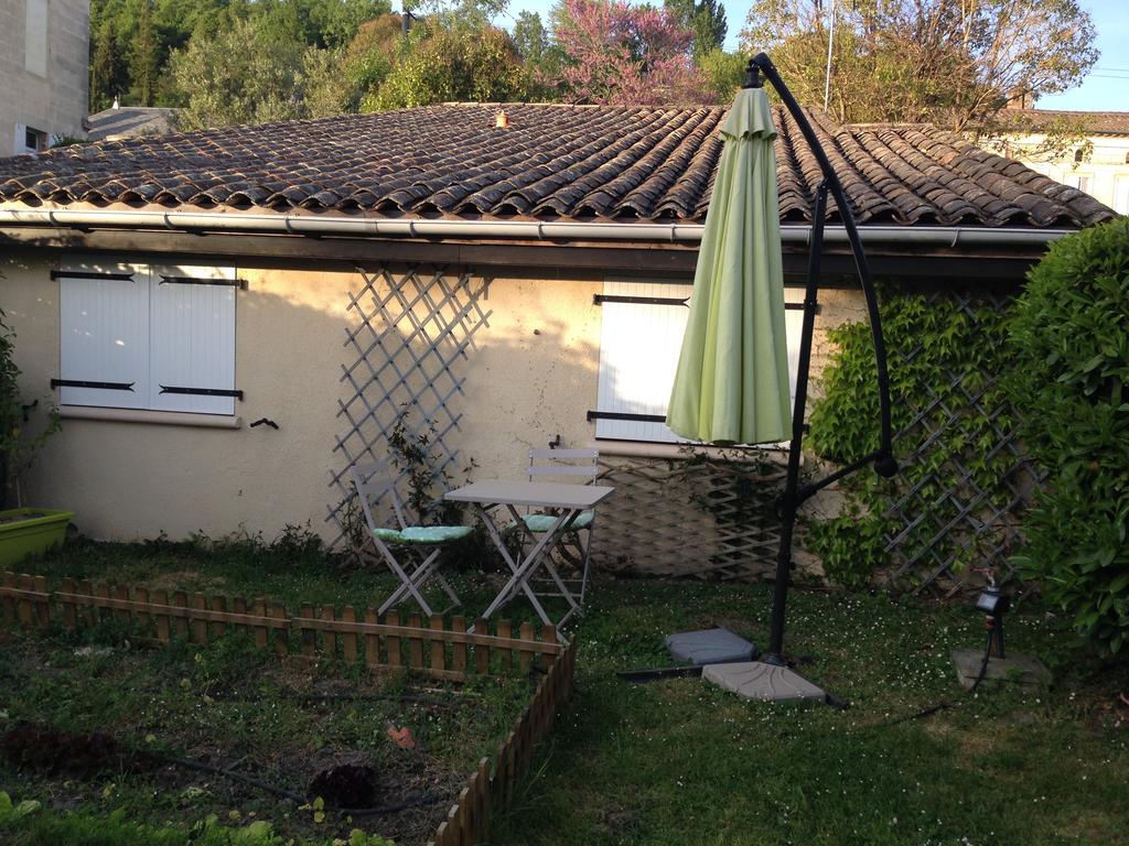 Description: A patio with a table and chairs and an umbrella over it in a backyard area with a fence and bushes.