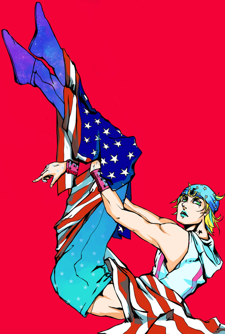 Description: A woman in a patriotic outfit is holding a flag and a man in a blue shirt is holding a red.