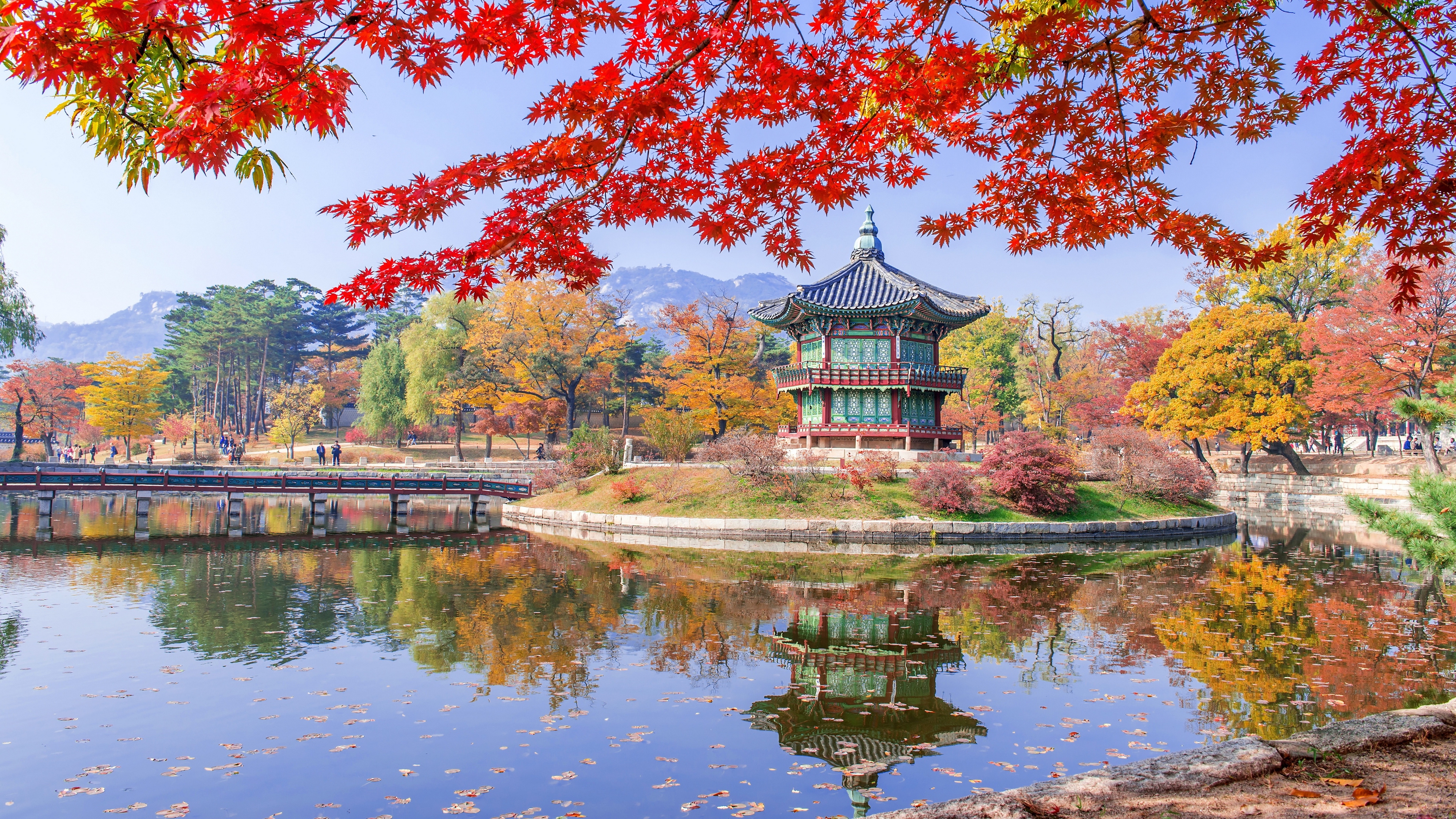 Description: A small pavilion in a park with a lake in front of it and a bridge in the background with red leaves.