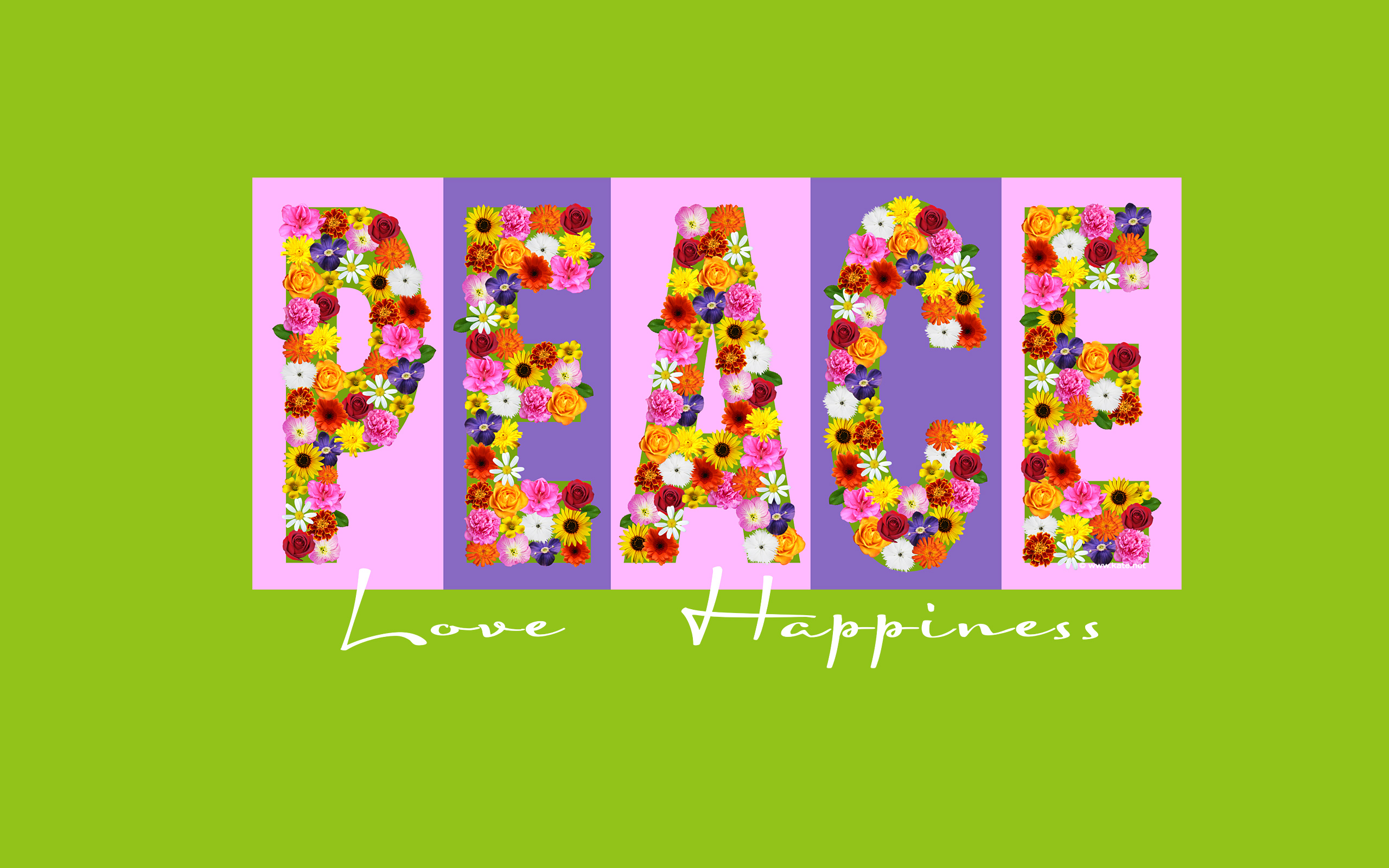 Description: A peace sign with flowers on it and the words peace above it in white letters on a green background.