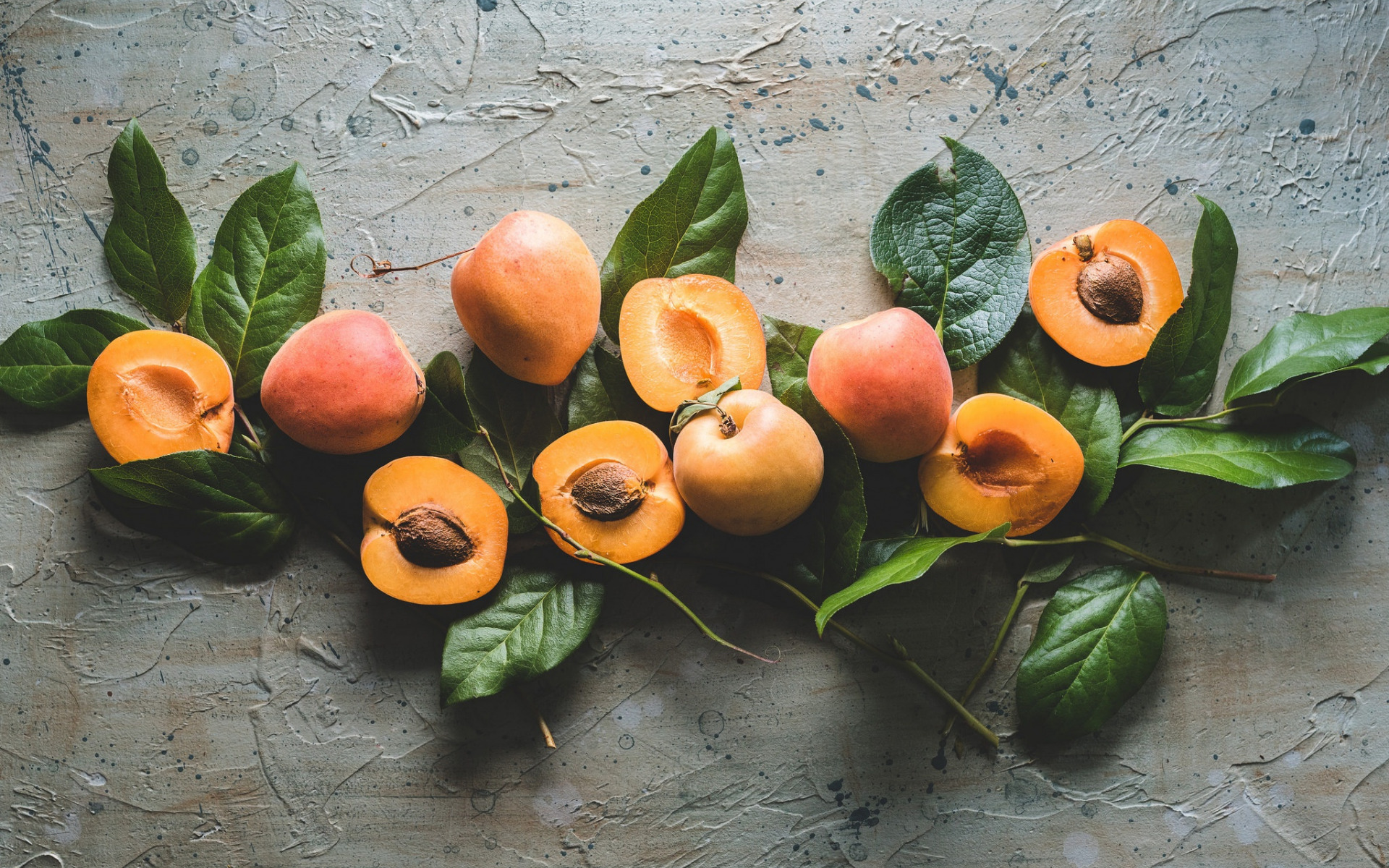 Description: A group of peaches with leaves on a table top with a gray background and a few peaches on the side.