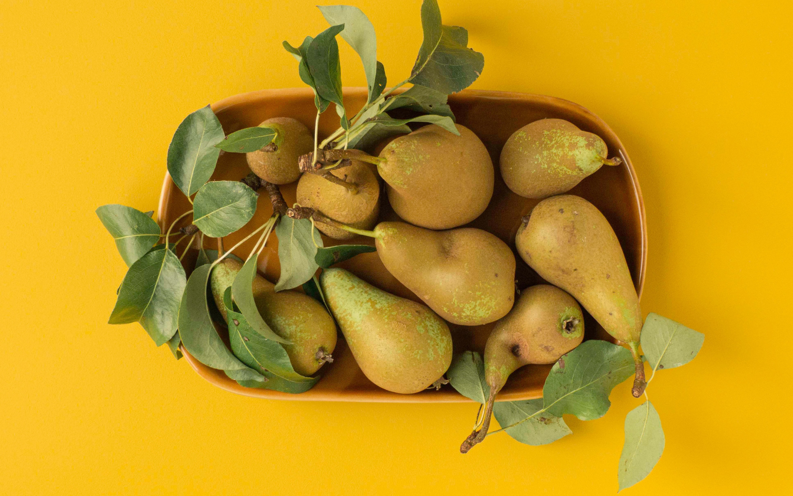 Description: A bowl of pears and leaves on a yellow background with a yellow background and a yellow background with a yellow background.