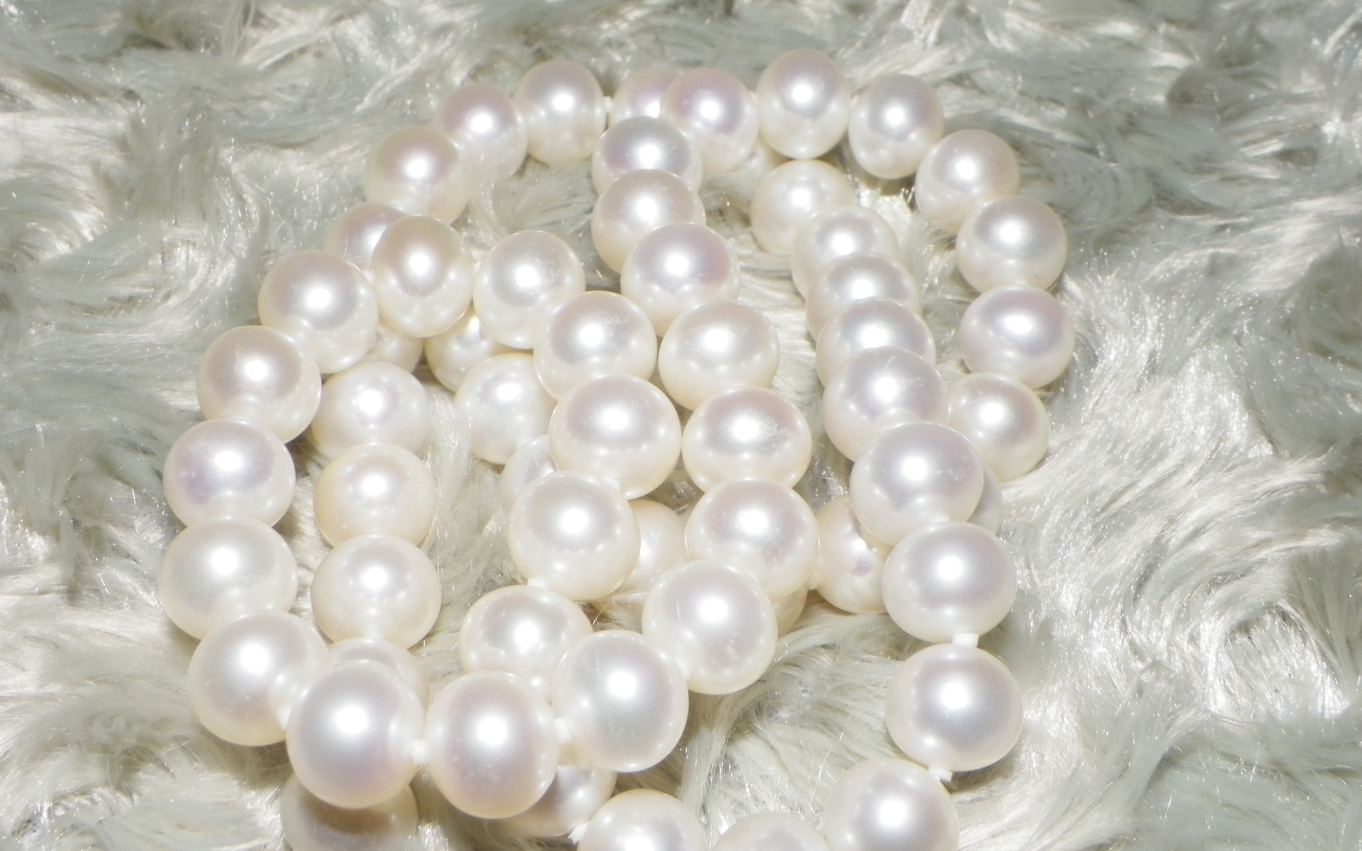 Description: A bunch of white pearls on a white fur background.
