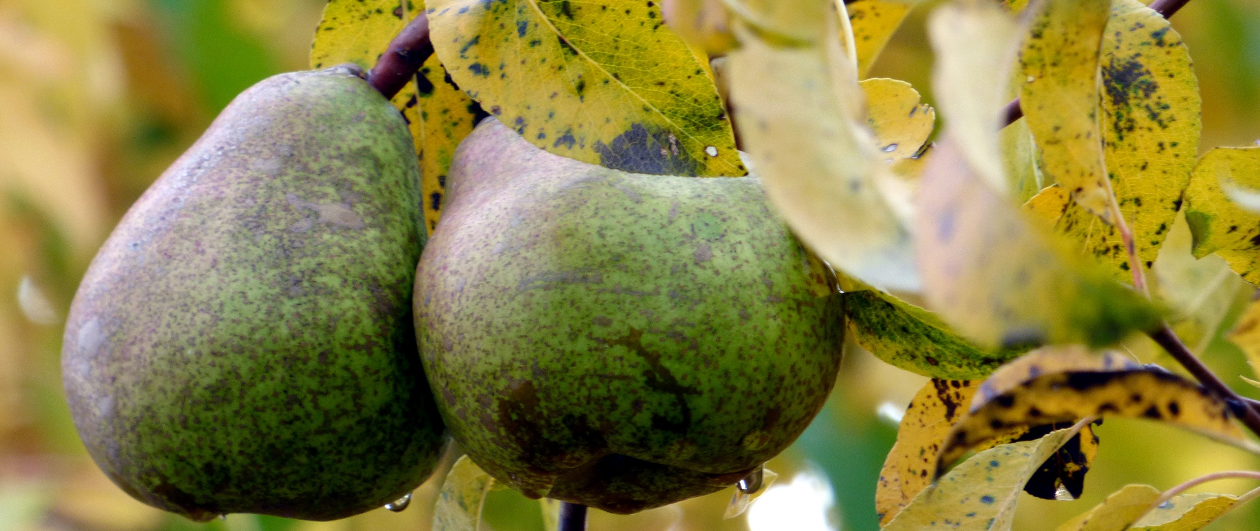 Description: A couple of pears hanging from a tree branch in a forest of leaves and leaves with yellow and green leaves.