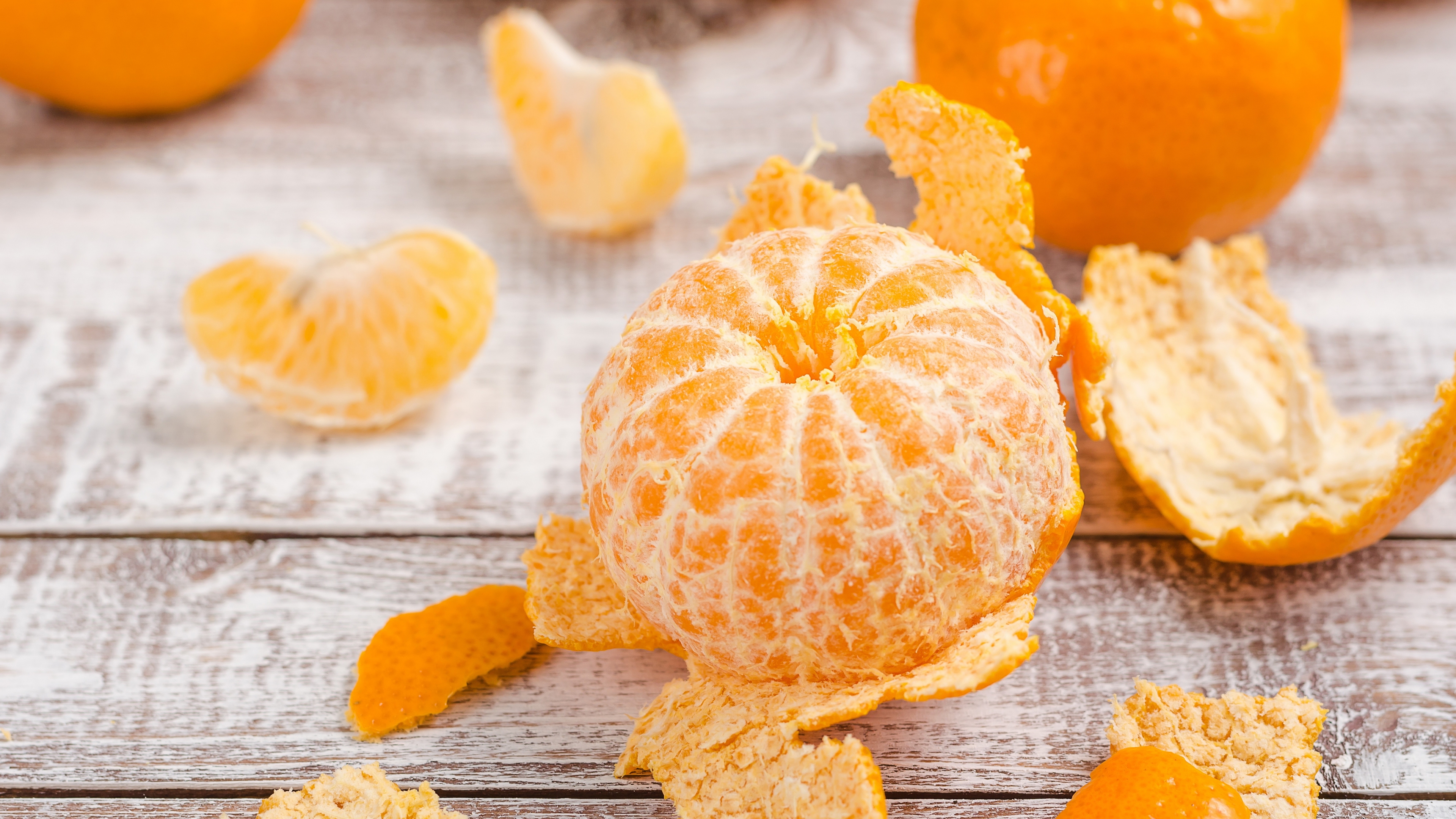 Description: A peeled orange sitting on top of a wooden table next to other peeled oranges and pieces of it.