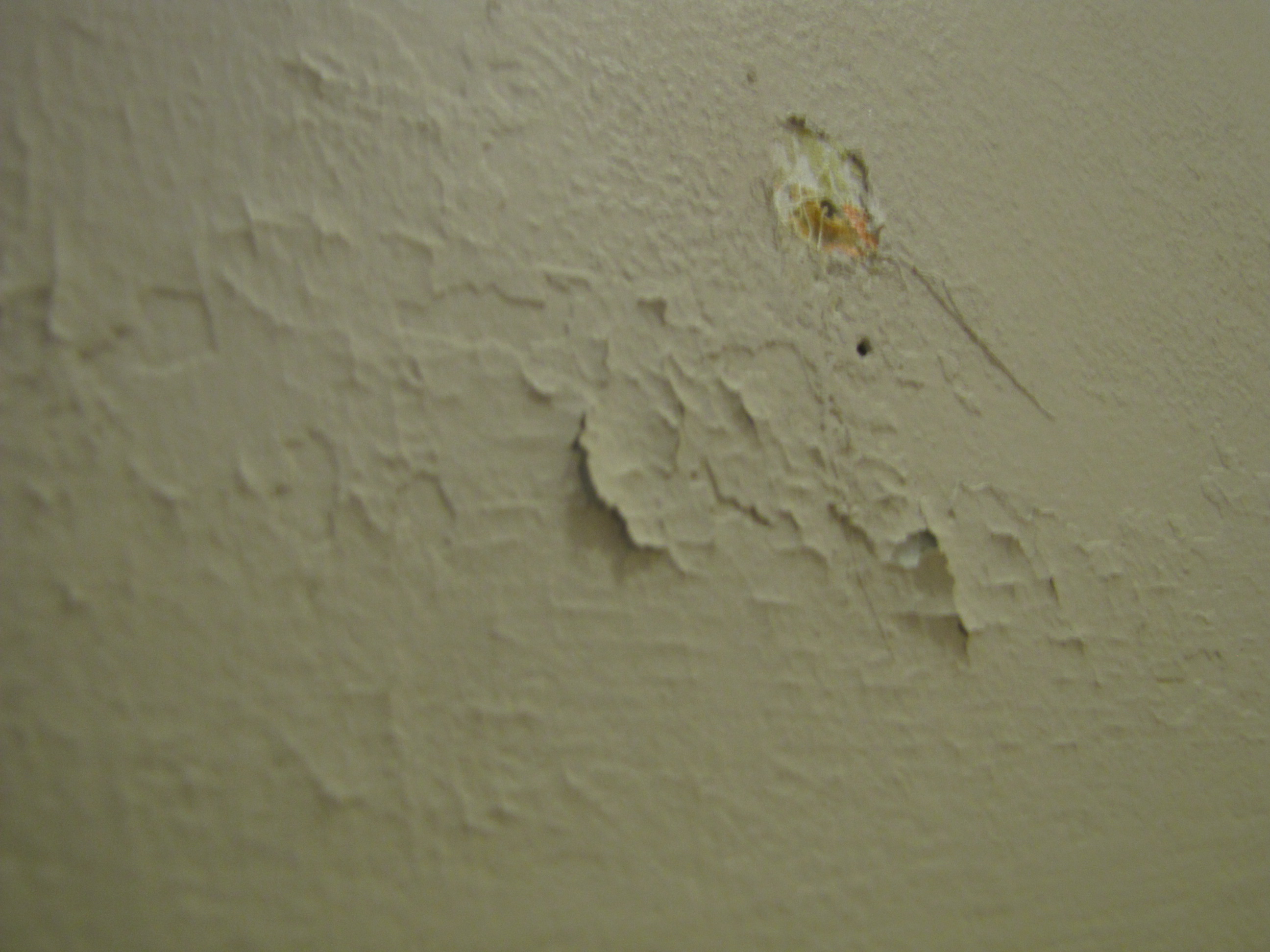 Description: A wall with a peeling paint and a white wall with a brown spot on it and a white wall with a brown spot on it.