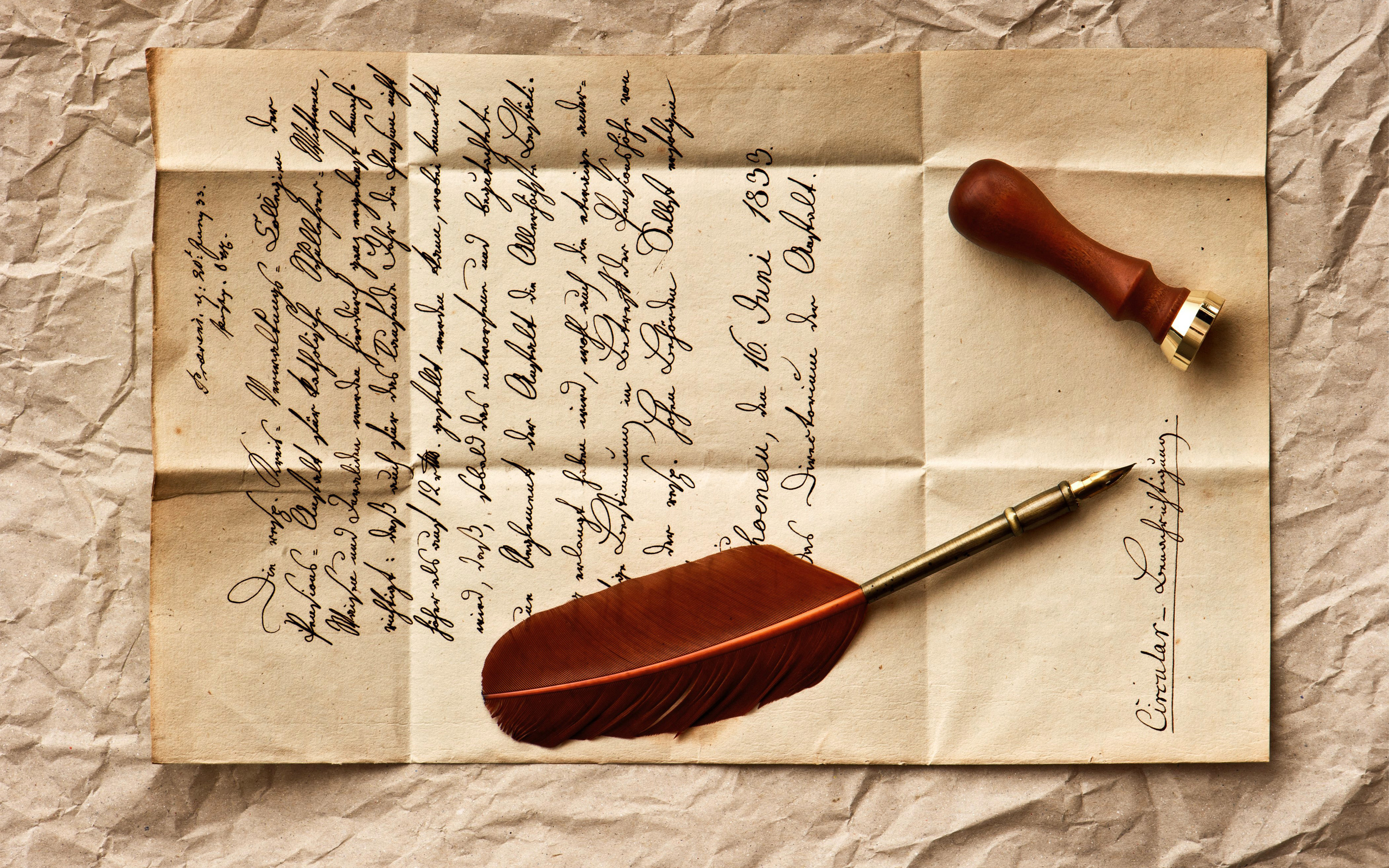 Description: A pen and a feather on a piece of paper with writing on it and a pen resting on top of it.