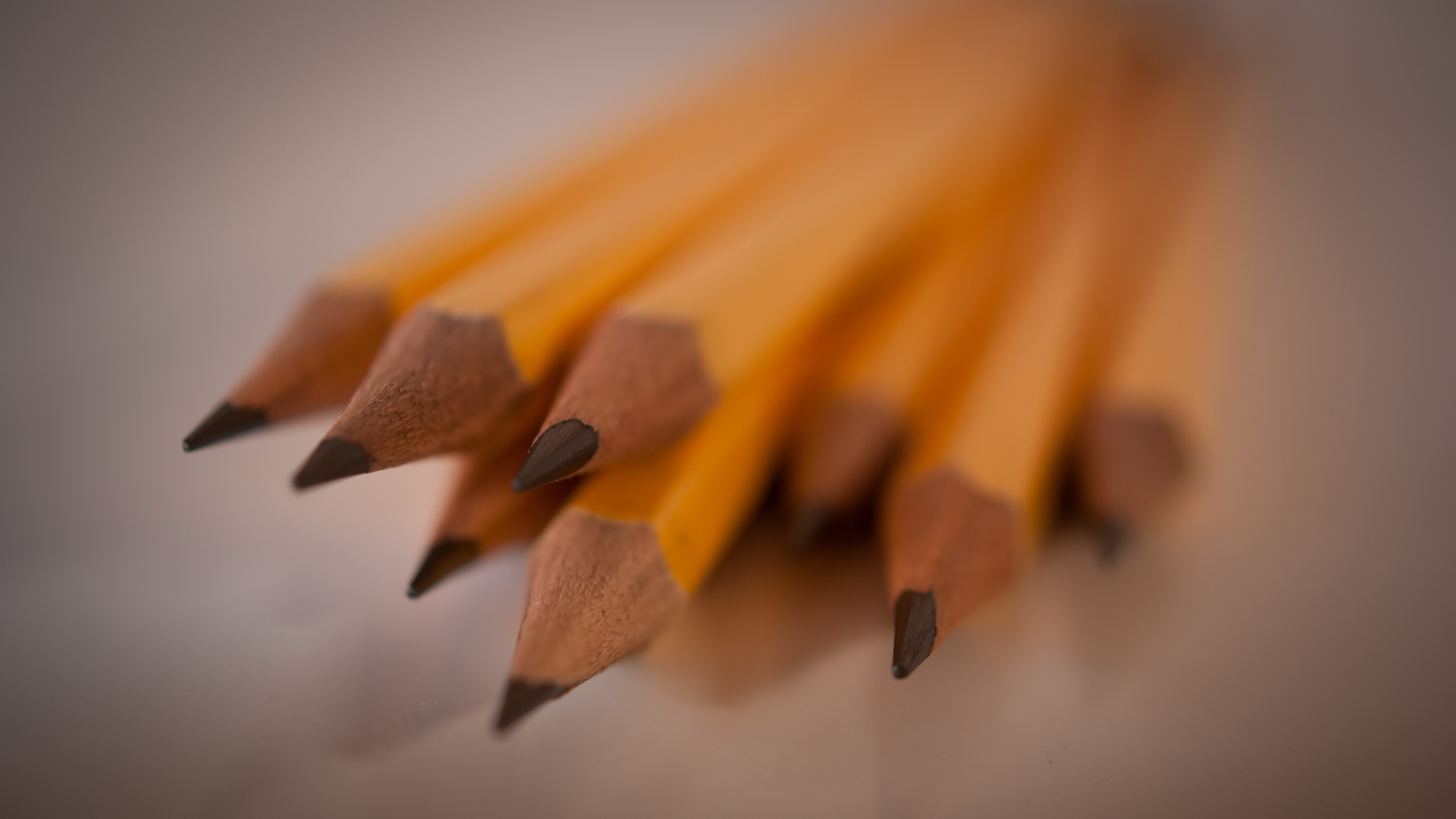Description: A group of pencils with a white background and a few yellow ones with black tips on them.