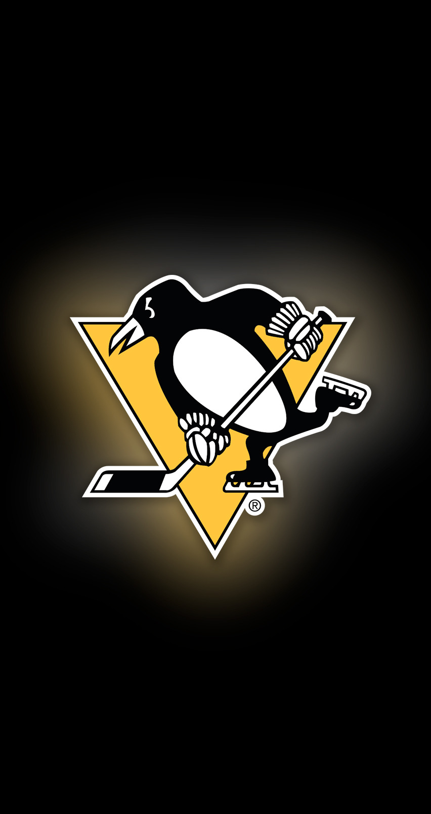 Description: A penguin with a hockey stick and a hockey puck on a black background with a yellow triangle and a yellow triangle.