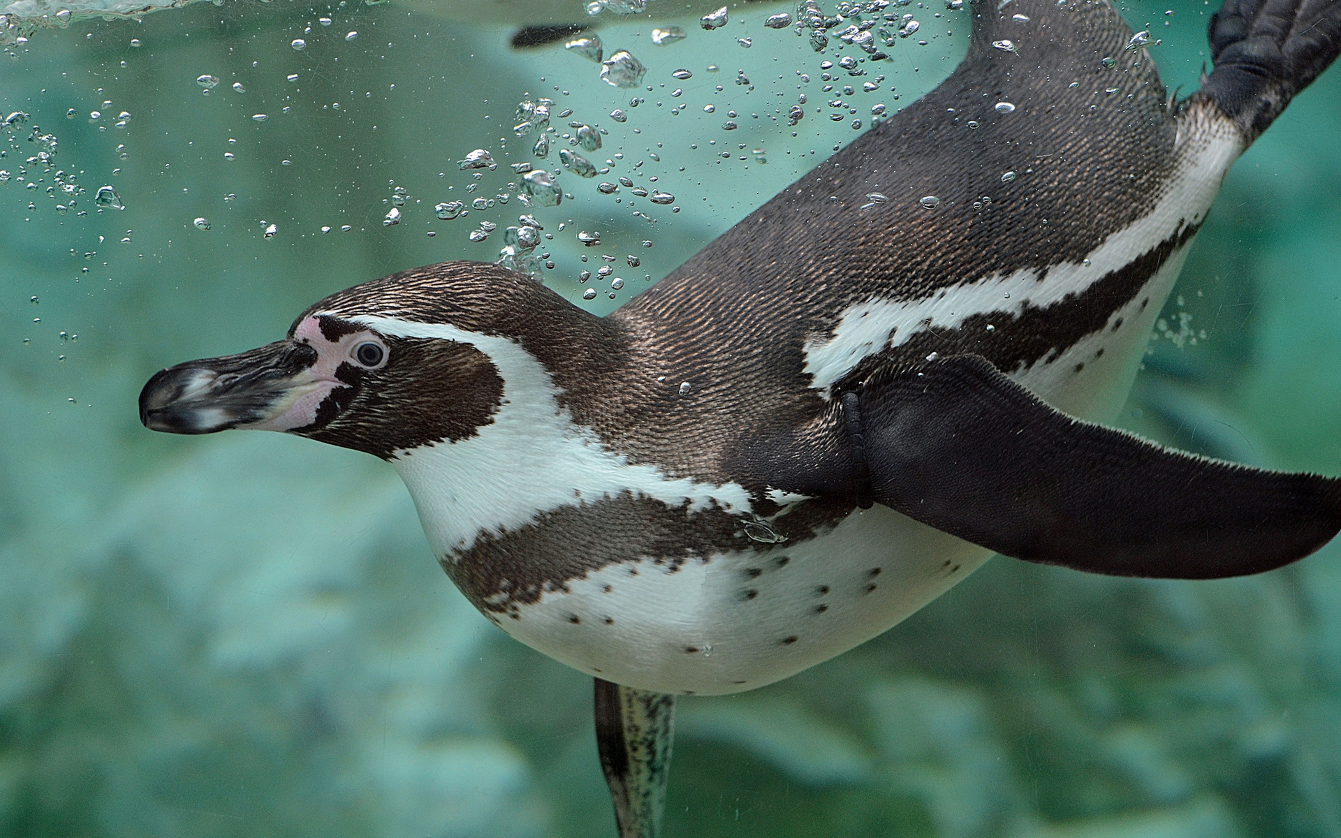 Description: A penguin swimming in the water with bubbles of water around it's head and neck.