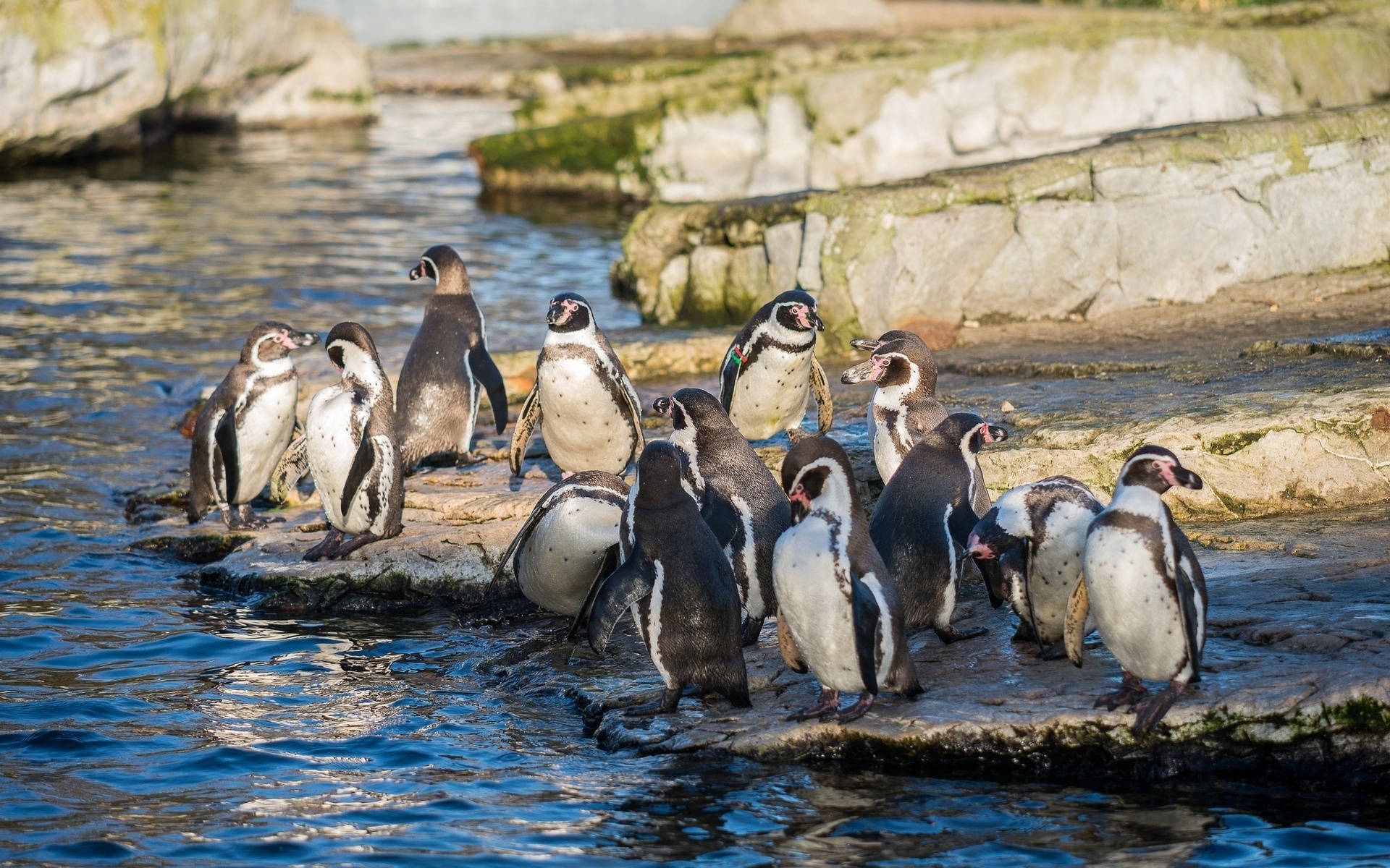 Description: A group of penguins standing on a rock in the water near a rock wall and a body of water.