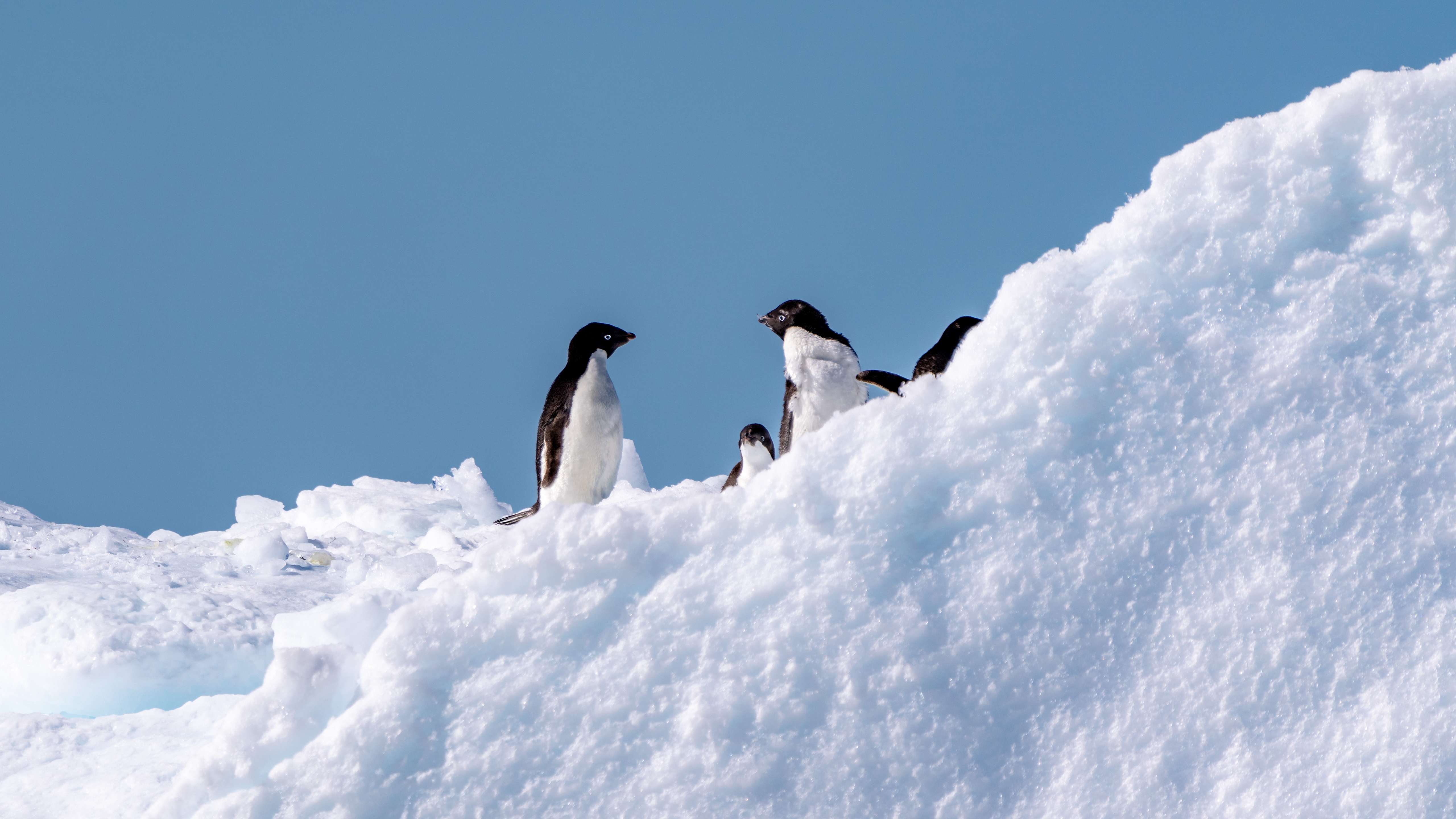 Description: Three penguins are standing on a snowy hill together.