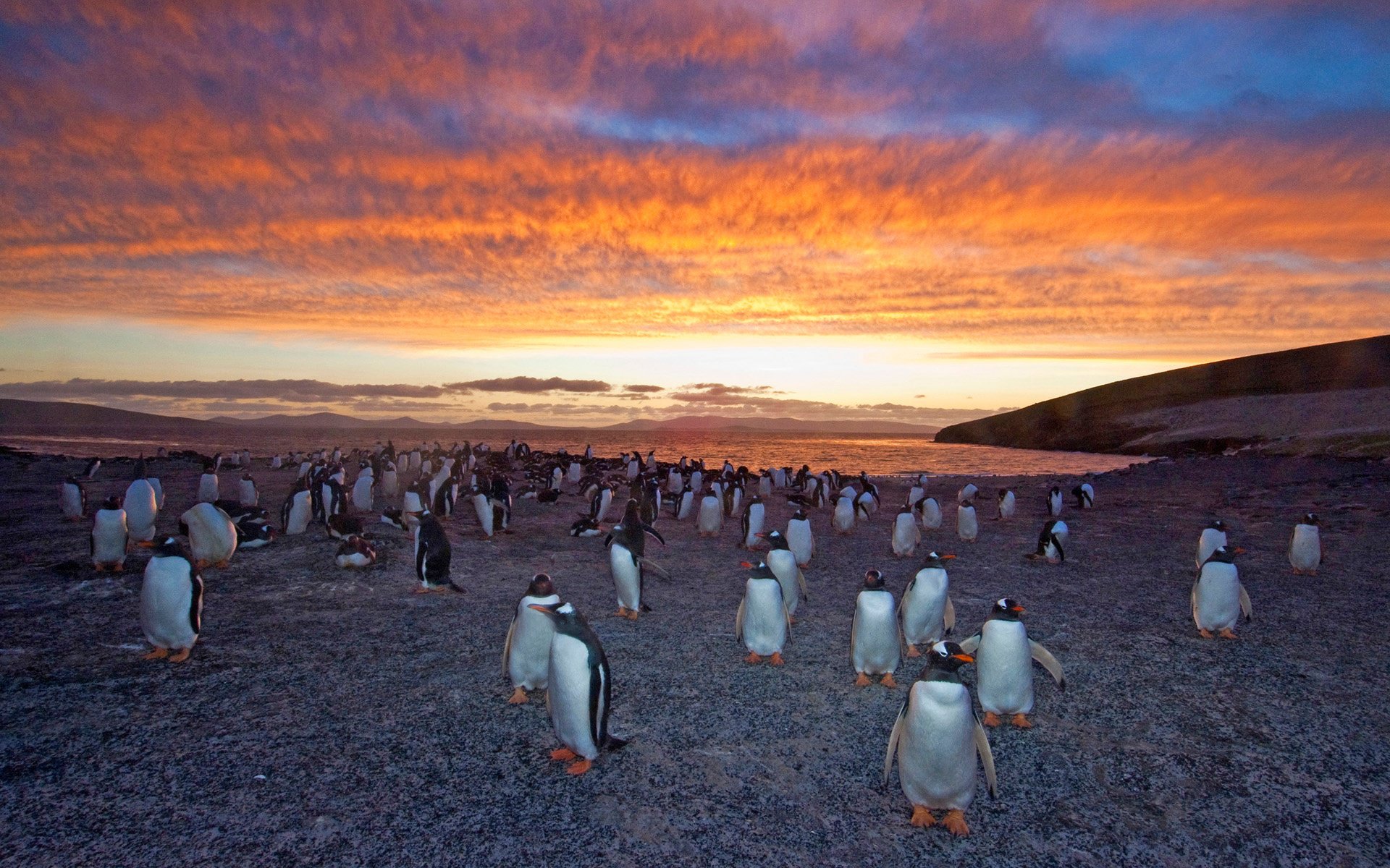 Description: A group of penguins walking across a field at sunset with a pink sky in the background and a few other penguins standing around.