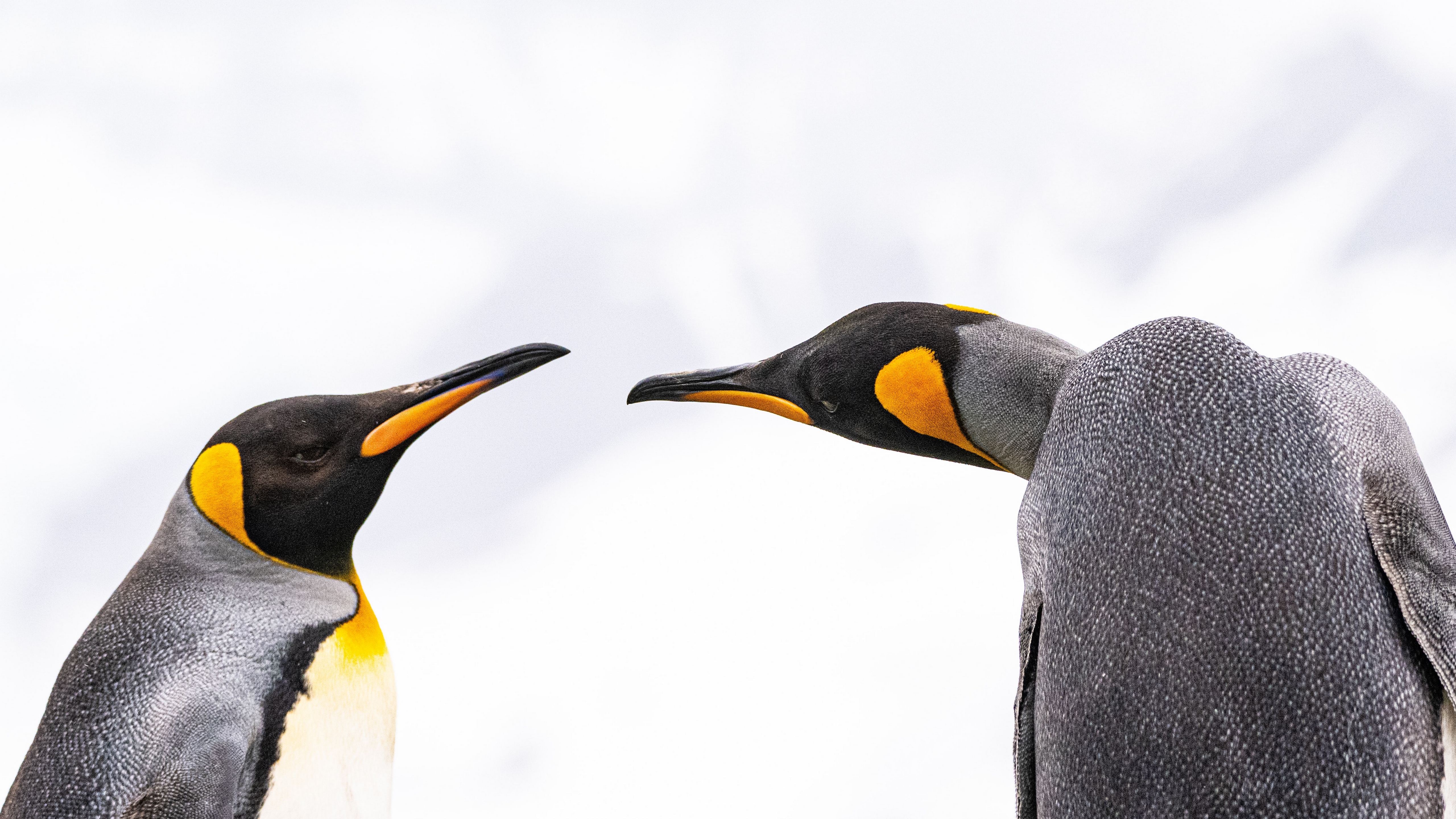 Description: Two penguins touching beaks with their beaks open and one penguin is looking at the other penguin's head.