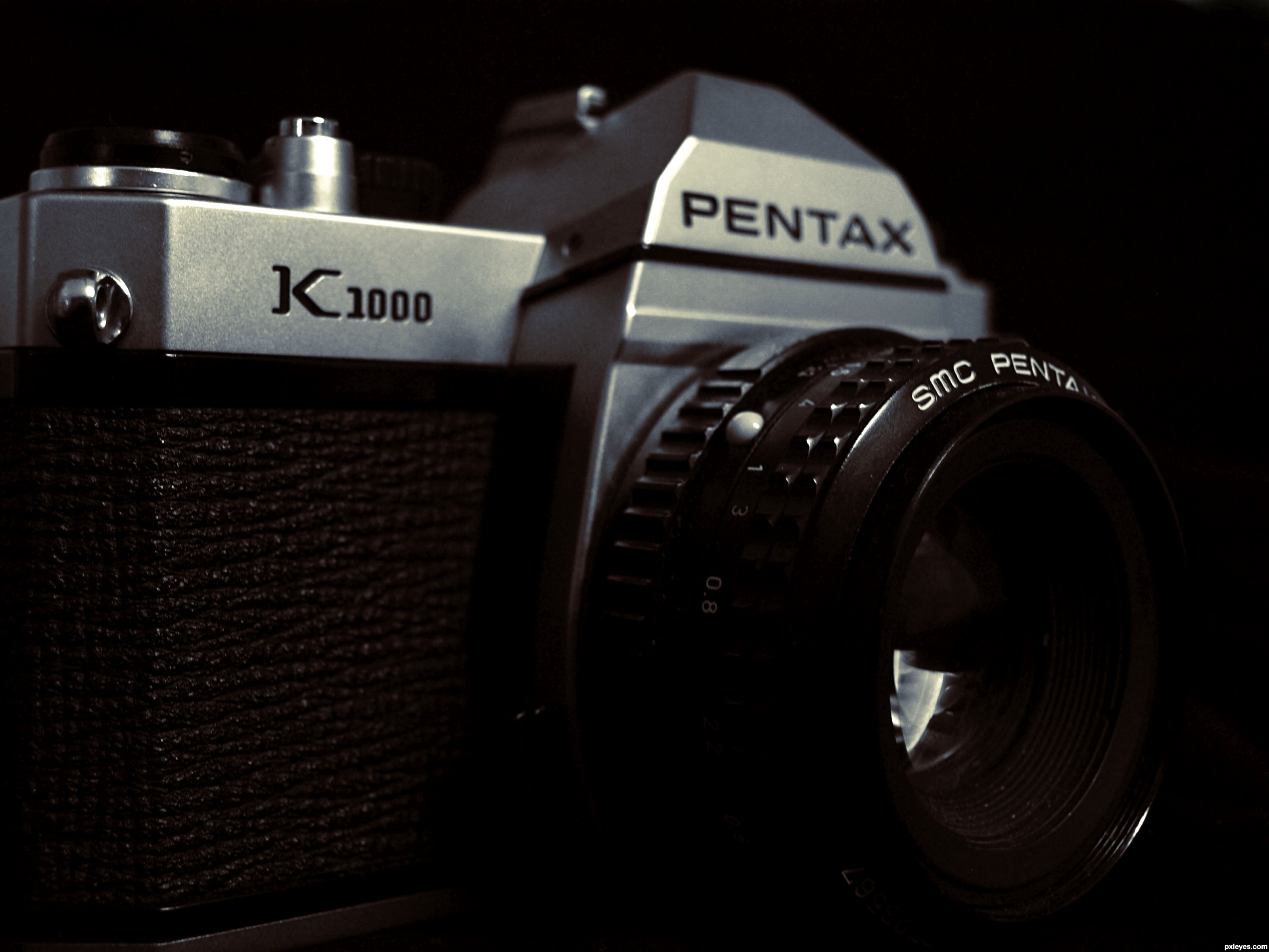Description: A pentax camera with a lens attached to it's body and a lens cap on the front.