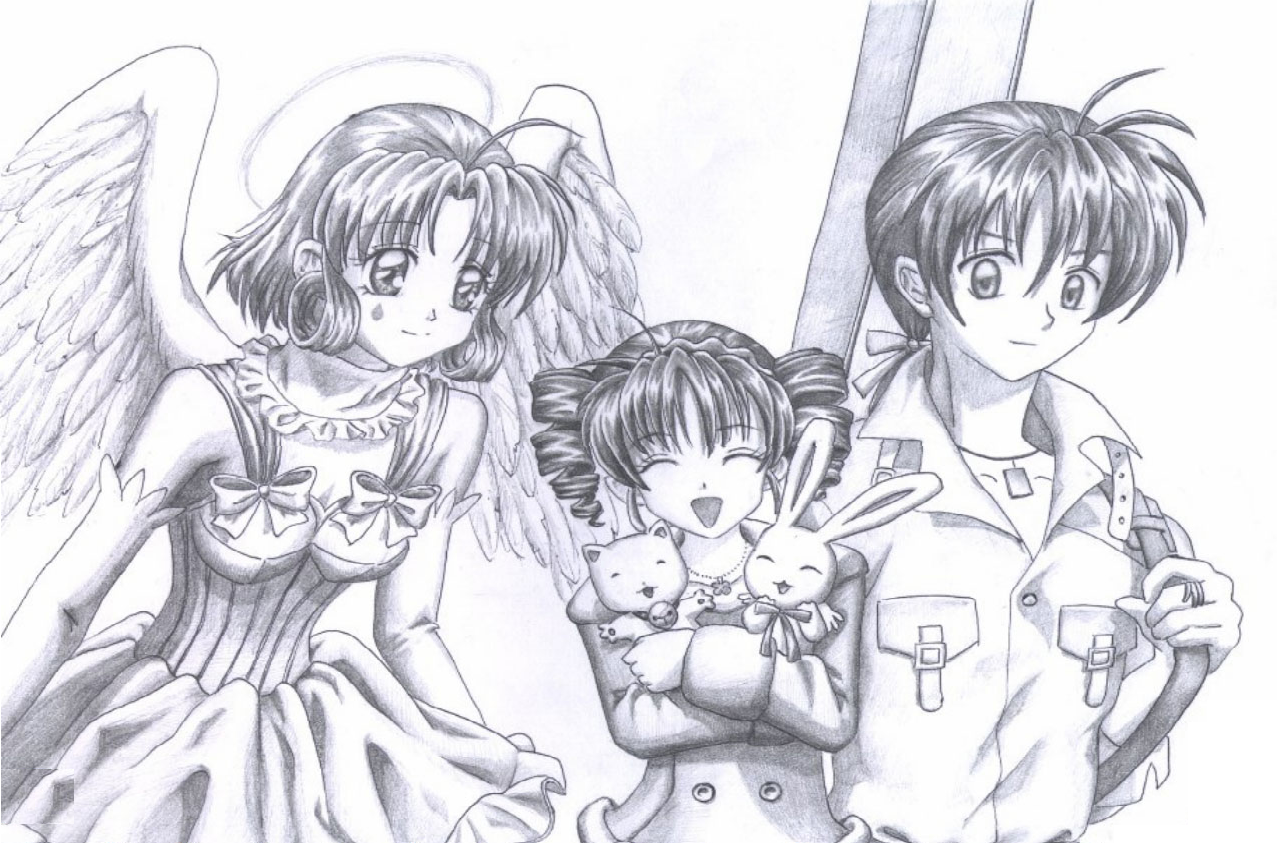 Description: A drawing of two people and a child with angel wings on their shoulders and a cross in the background.