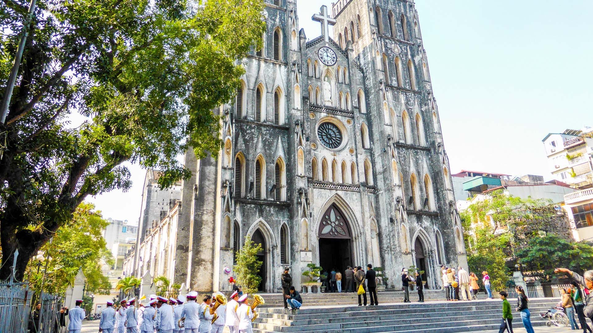 Description: A group of people standing in front of a church with a clock on it's side and stairs.