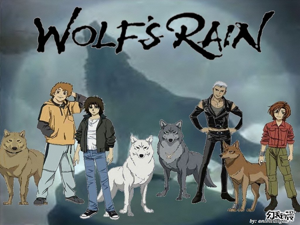 Description: A group of people standing next to each other with dogs and a wolf on the background of a mountain.
