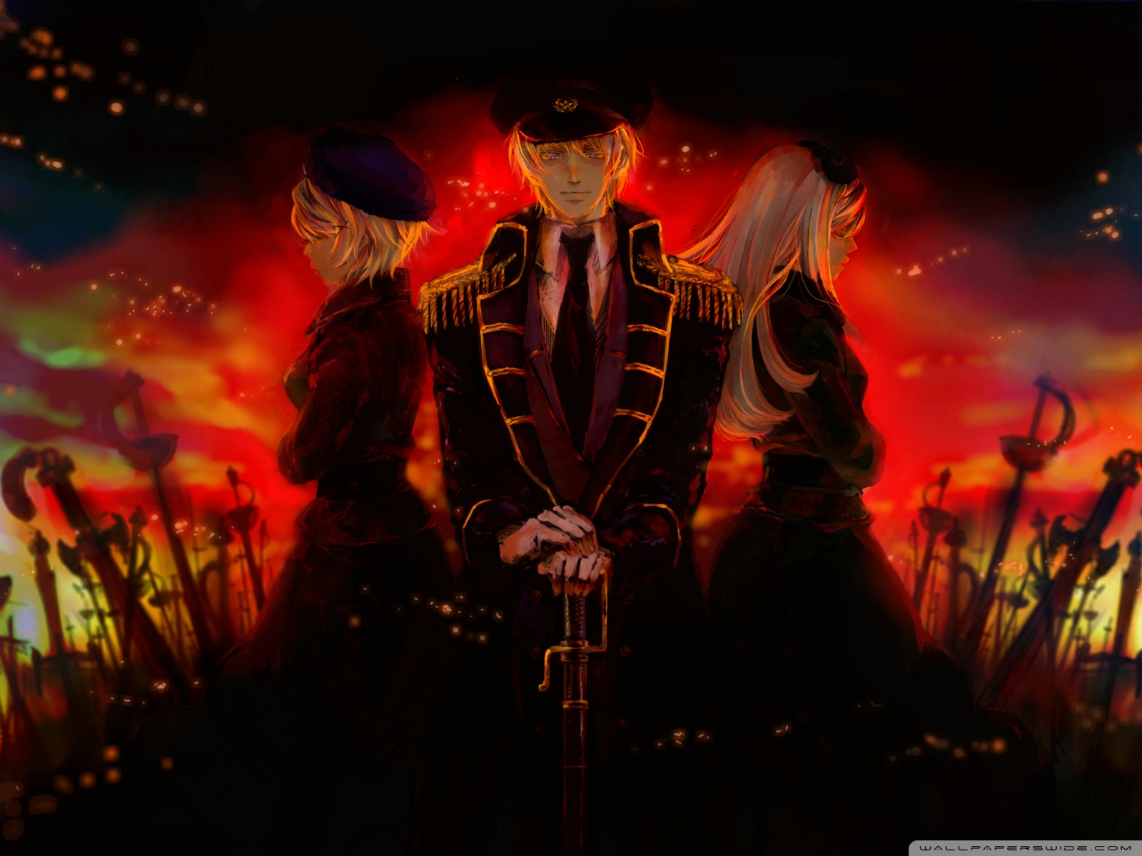 Description: A painting of two people in a field of flowers with a red sky behind them and a red and yellow background.
