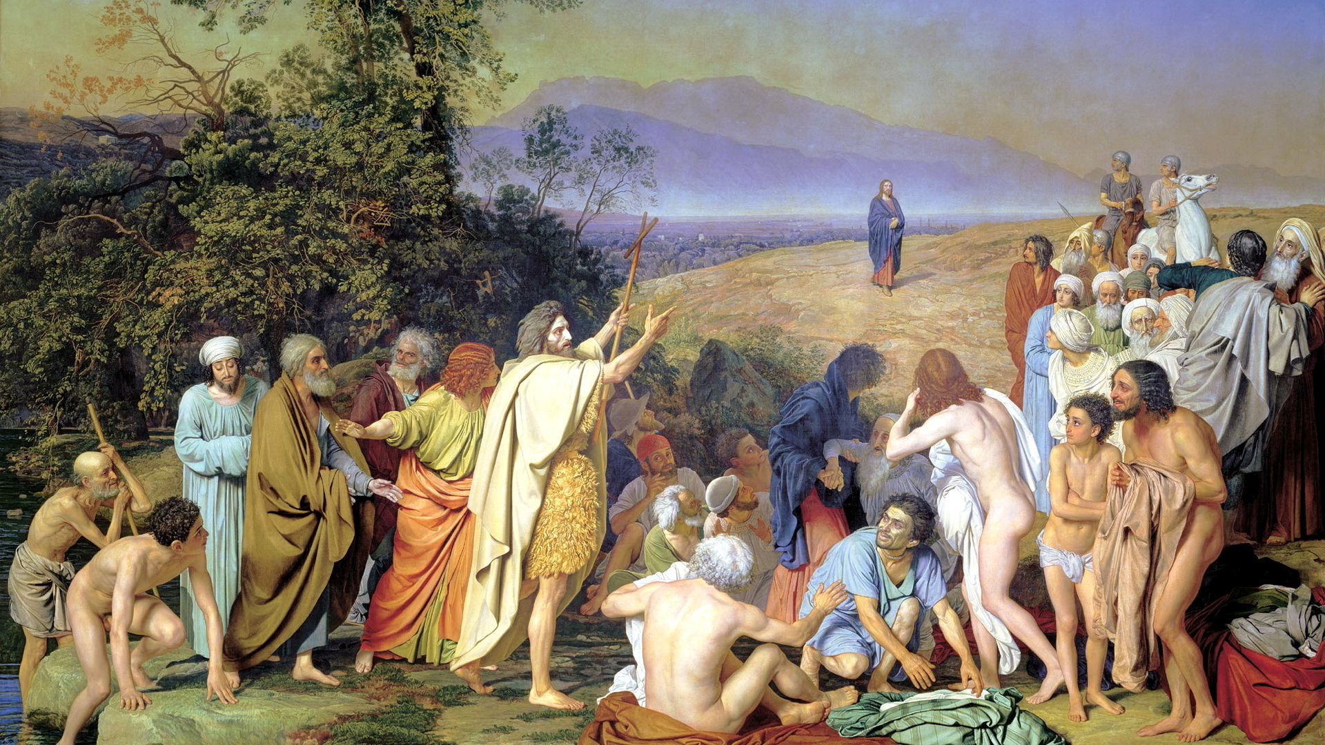 Description: A painting of a group of people in a field with trees and hills in the background.