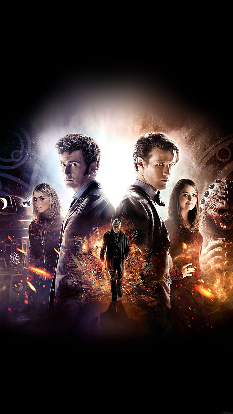 Description: A group of people standing in front of a fire and flames background with a doctor who appears to be holding a gun.