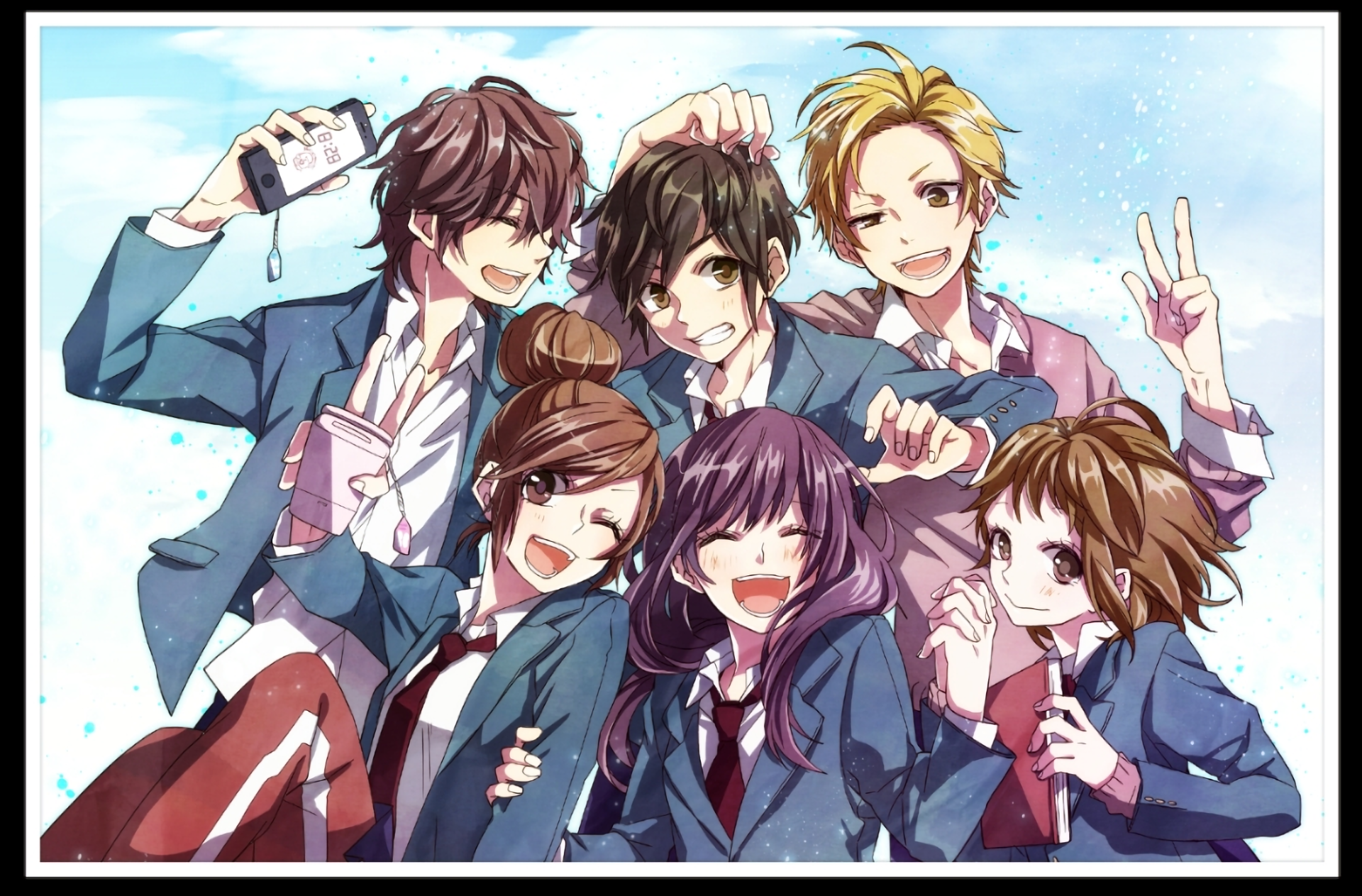 Description: A group of people standing next to each other in front of a sky background with clouds and a sky background.