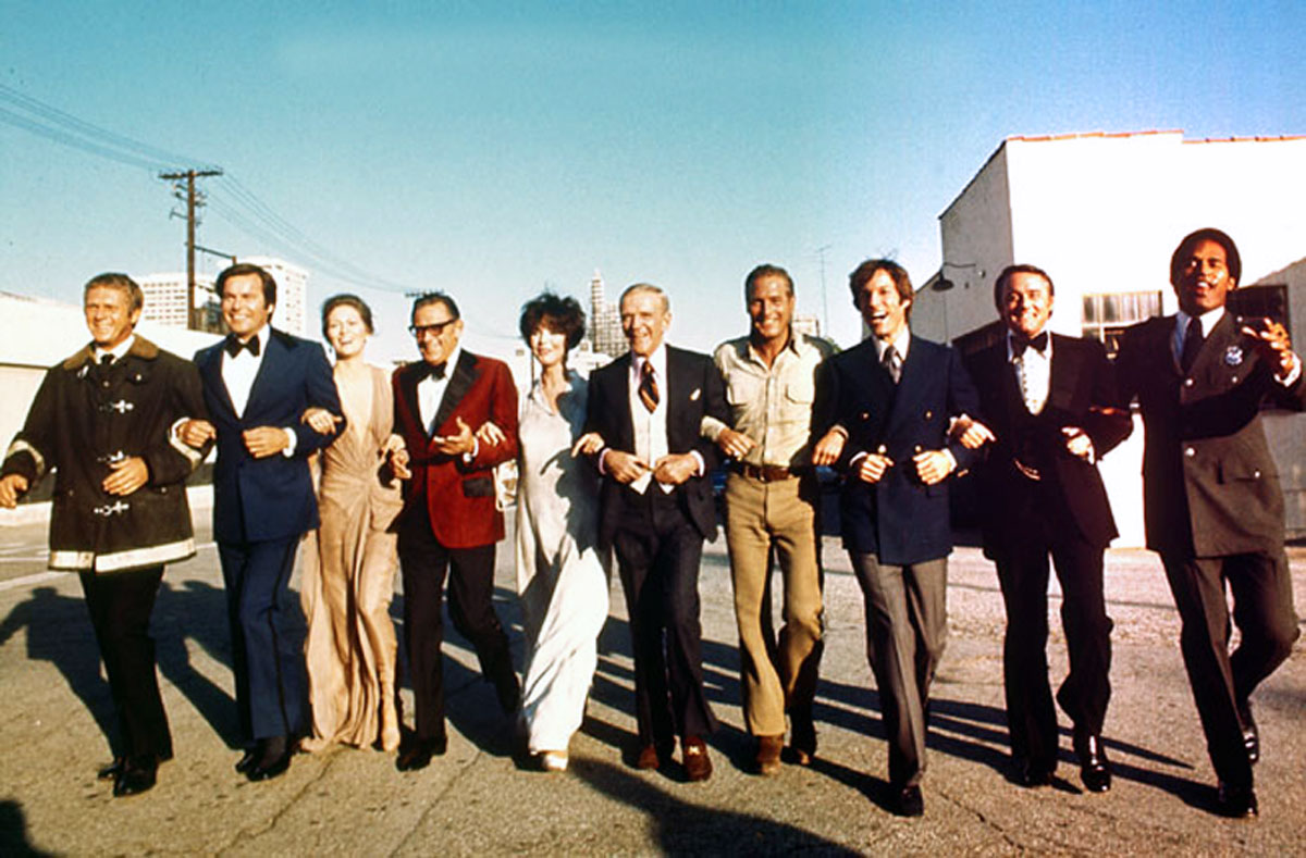 Description: A group of people standing next to each other on a street corner with a building in the background and a sky background.