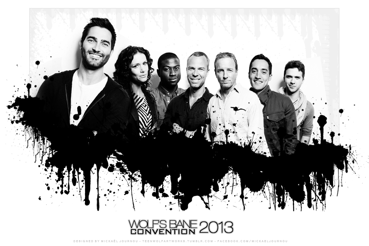 Description: A group of people standing next to each other in front of a white background with black paint splatters.