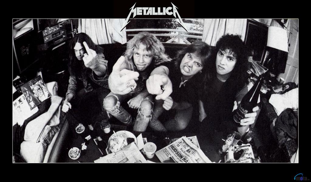 Description: A group of people sitting around a table with a guitar and a microphone in their hand and a picture of a band on the wall.