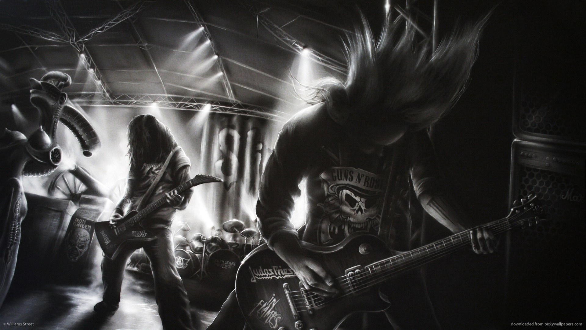 Description: A drawing of a group of people playing guitars in a room with a skeleton on the wall and a man with a guitar.