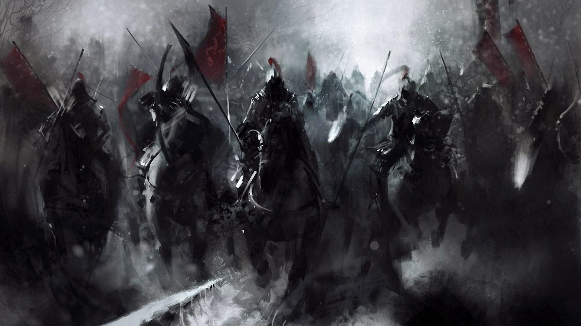 Description: A group of people on horses in the snow with flags on their backs and a man on horseback in the background.