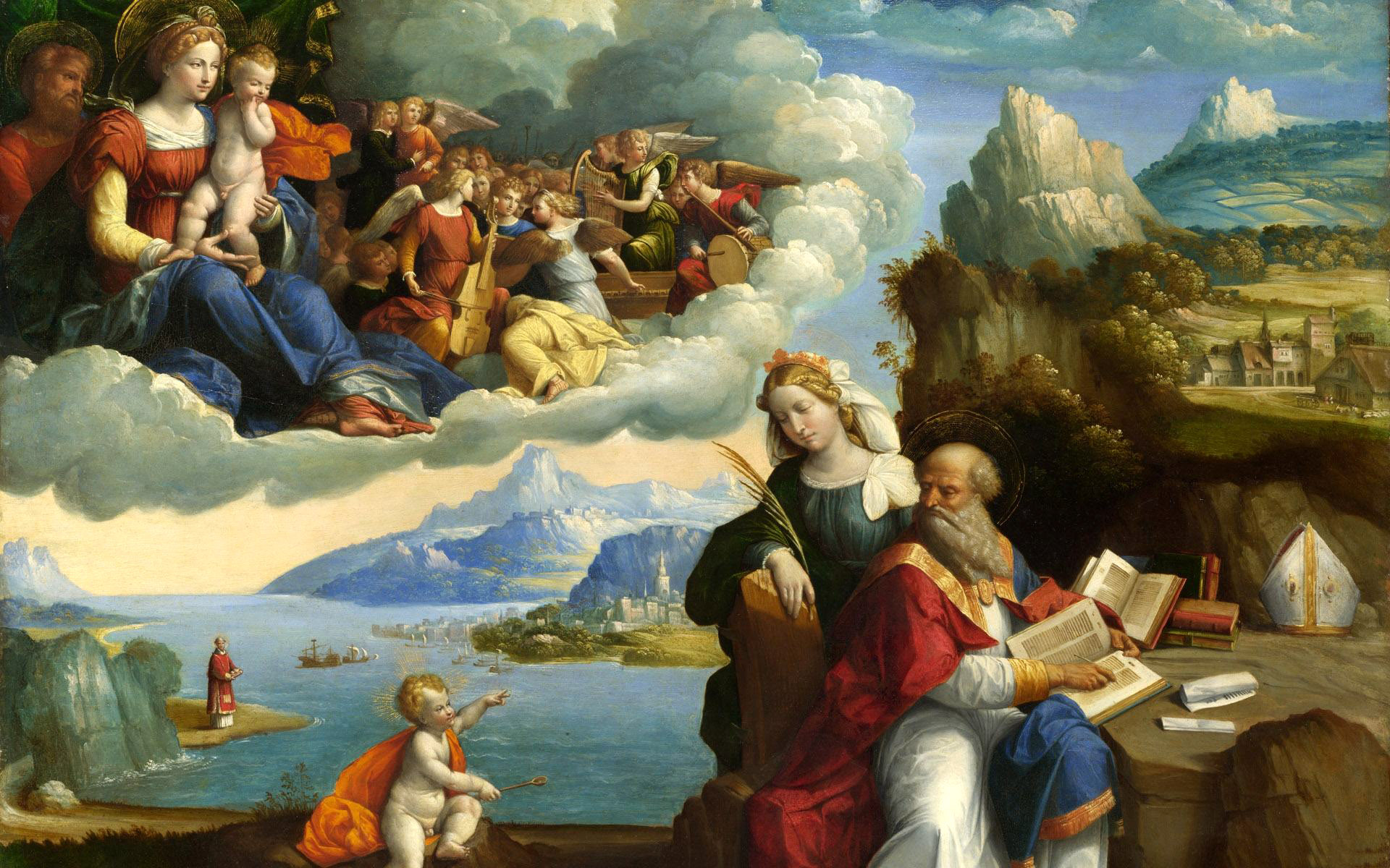 Description: A painting of a group of people in a landscape with clouds and mountains in the background.